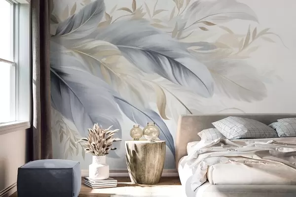 Fototapet Pene texturate în culori pastelate și frunze delicate pe un fundal deschis Nr. w09763