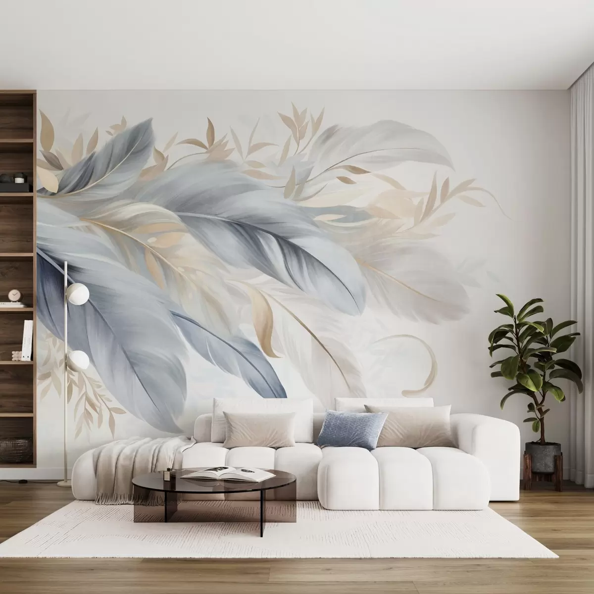 Fototapet Pene texturate în culori pastelate și frunze delicate pe un fundal deschis Nr. w09763