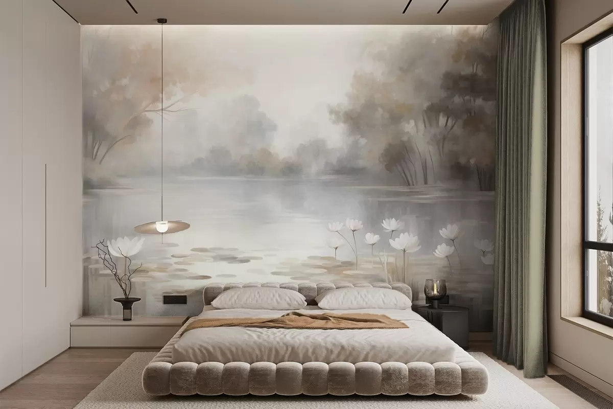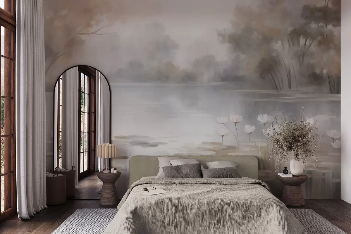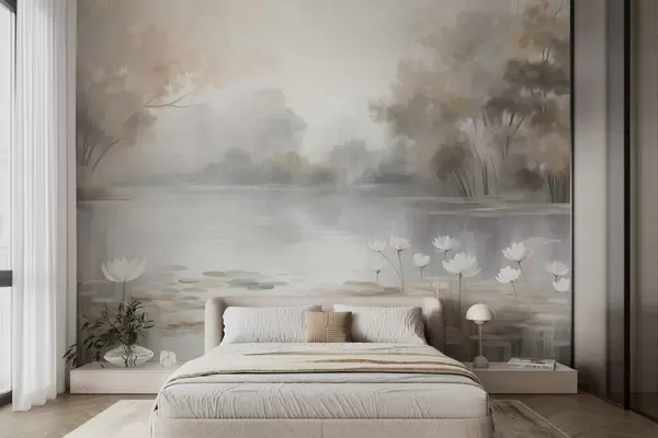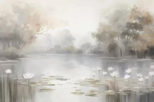 Fototapet Peisaj cu relief variat, lac cu nuferi albi, înconjurat de copaci în culori discrete Nr. w09768