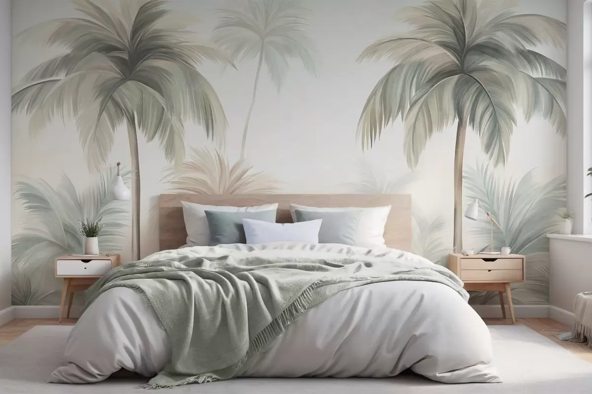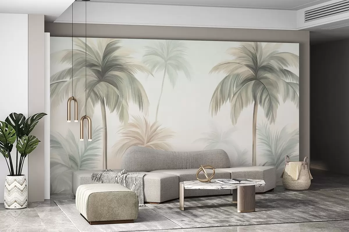 Fototapet Copaci cu frunze în formă de palmă, de un verde și bej estompat, pe fundalul unui cer deschis Nr. w09770