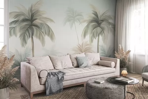 Fototapet Copaci cu frunze în formă de palmă, de un verde și bej estompat, pe fundalul unui cer deschis Nr. w09770