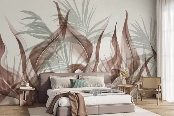 Fototapet Frunze tropicale în nuanțe de maro și verde pe fond alb, în stil acuarelă texturat Nr. w09772
