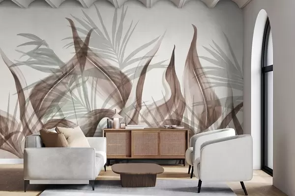 Fototapet Frunze tropicale în nuanțe de maro și verde pe fond alb, în stil acuarelă texturat Nr. w09772