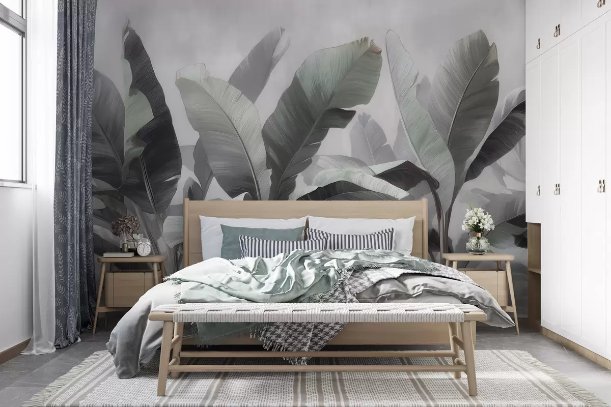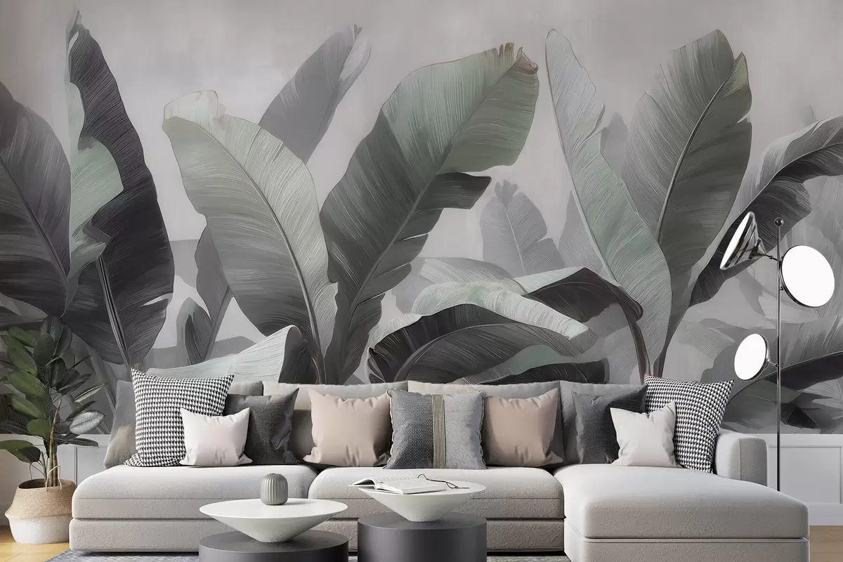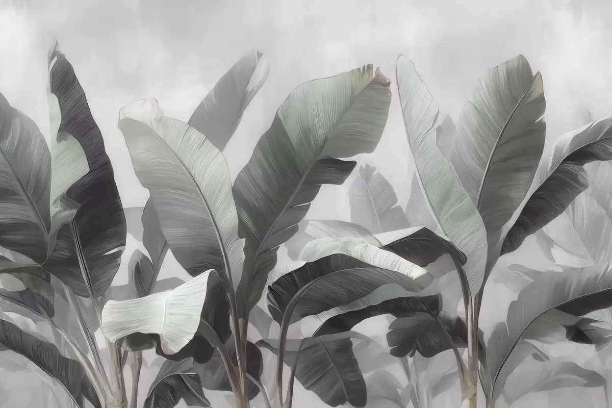 Fototapet Frunze mari de bananier în stil abstract, într-o paletă de culori neutre, cu nuanțe delicate de gri-verde Nr. w09805