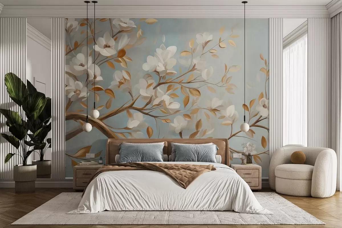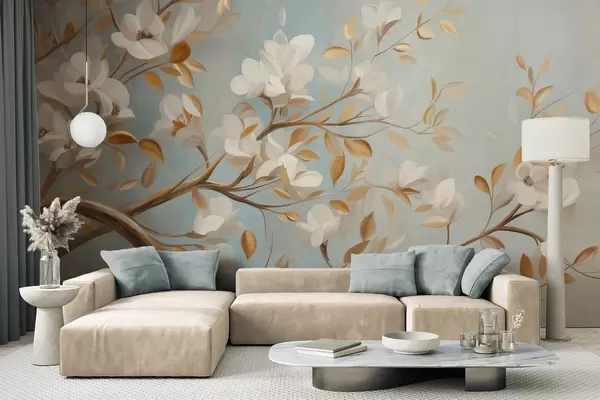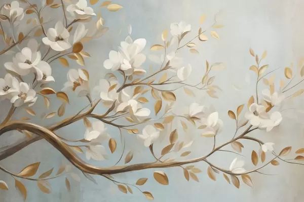 Fototapet Ramură de copac cu textură, cu flori albe și frunze galbene, în stil vintage Nr. w09814