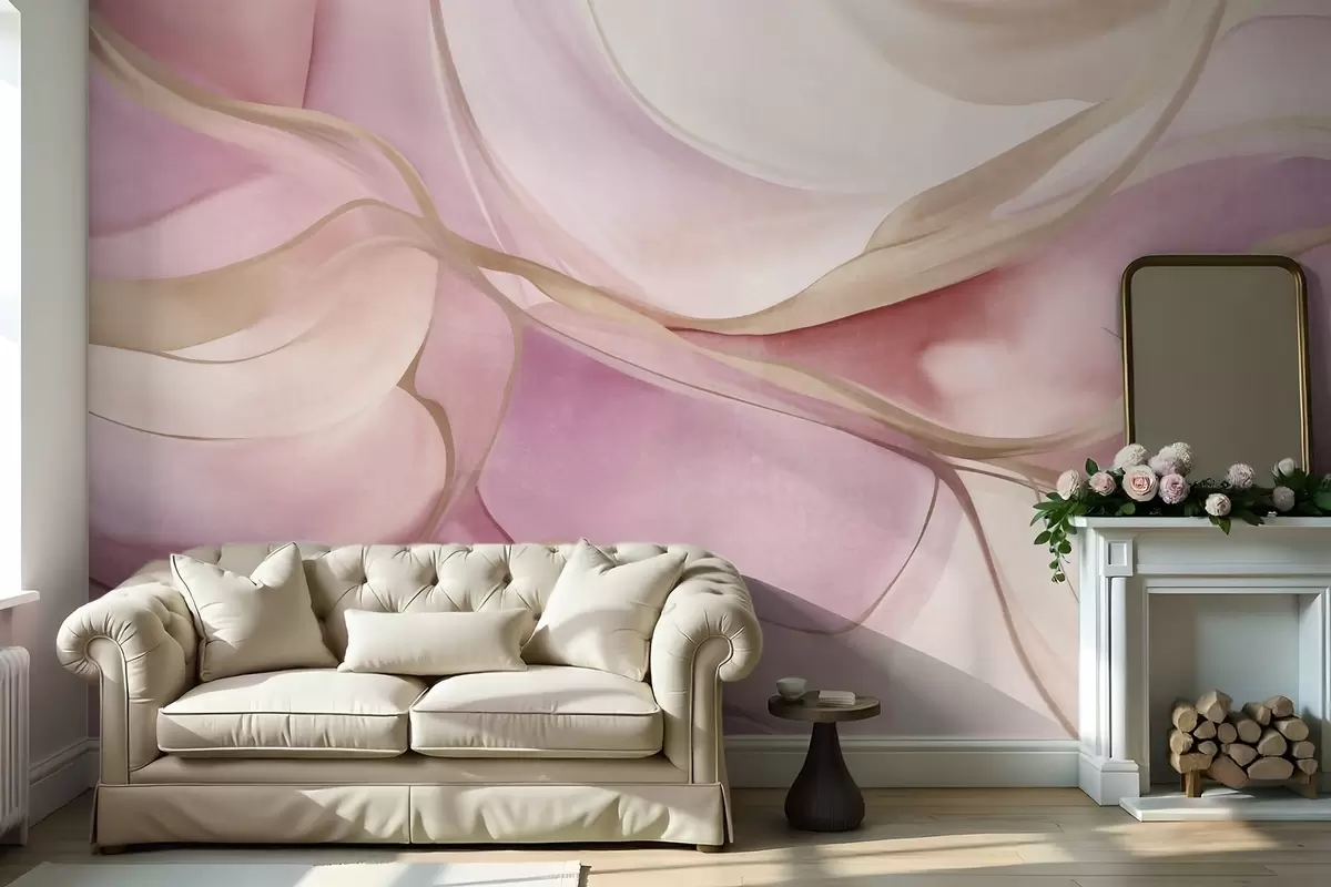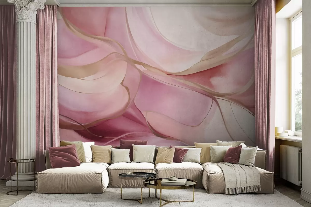 Fototapet Forme fluide, abstracte și texturate, în nuanțe de roz și bej, cu linii delicate de culoare galbenă Nr. w09818