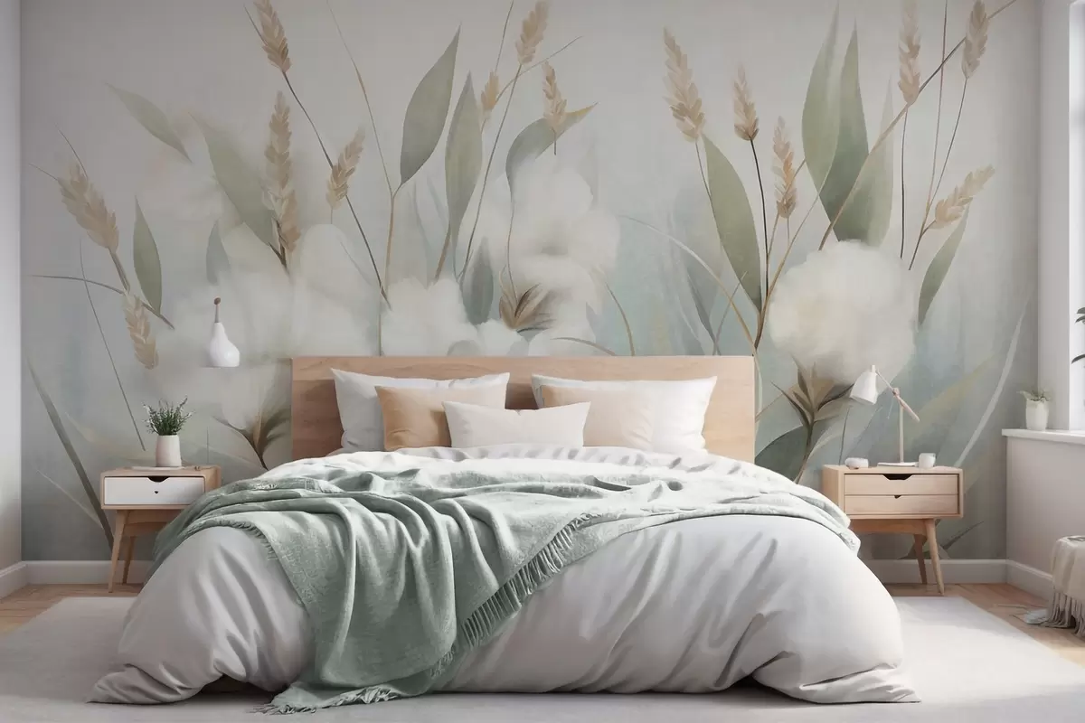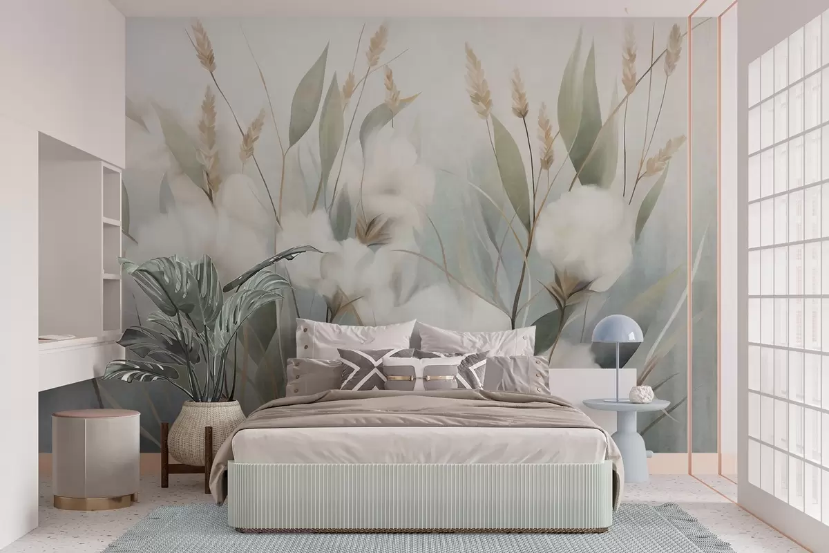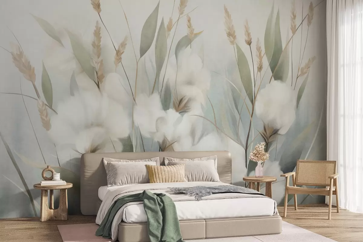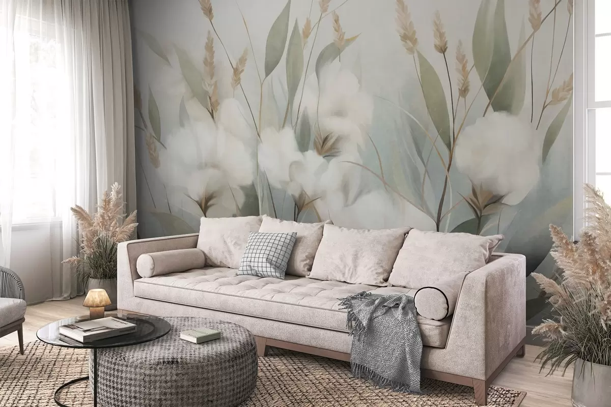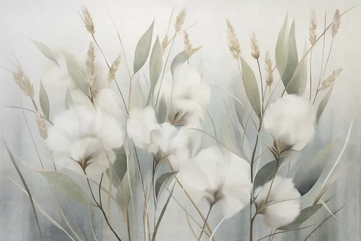 Fototapet Flori albe uscate și iarbă înaltă pe un fundal delicat și discret, pictate în stil impresionist Nr. w09823