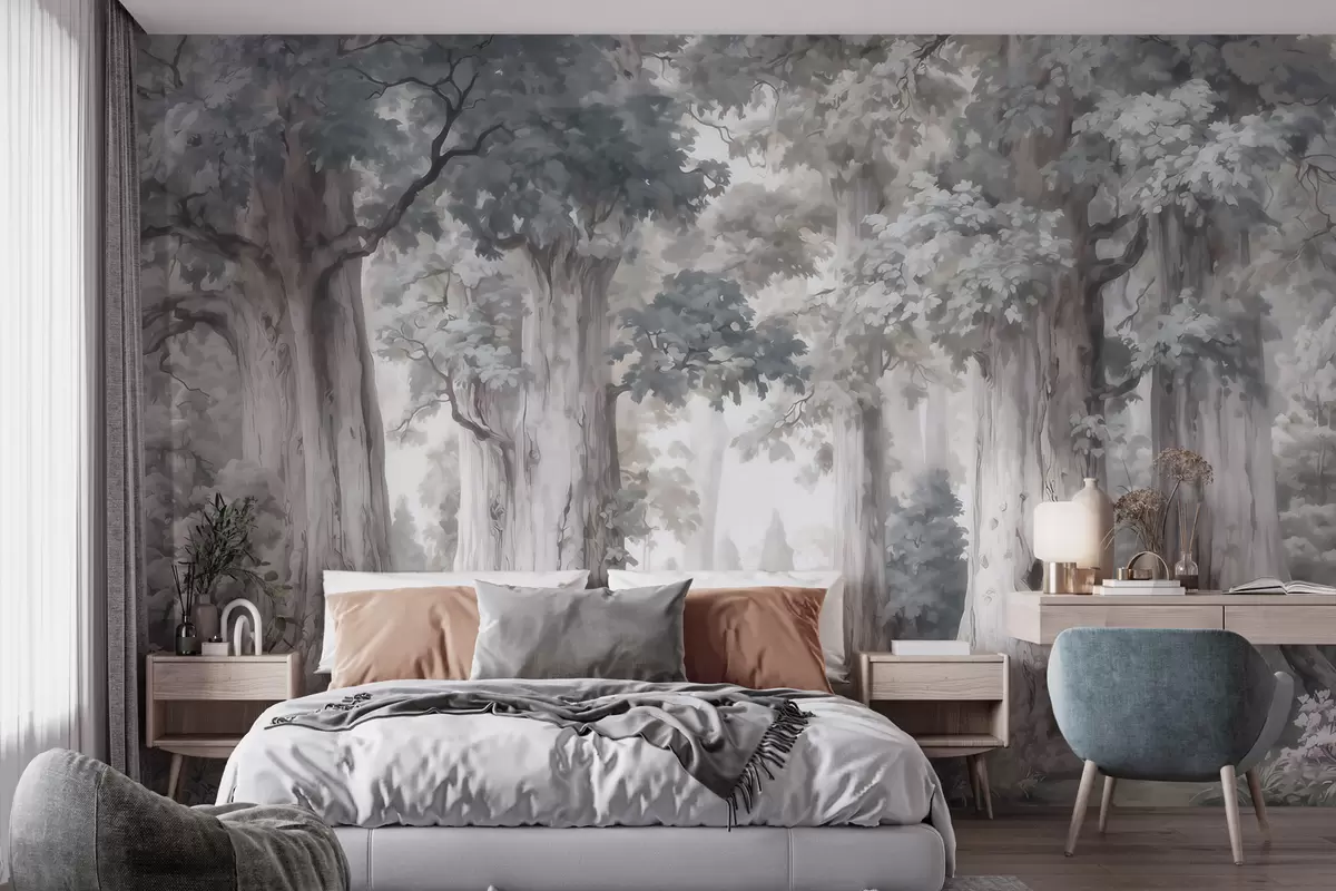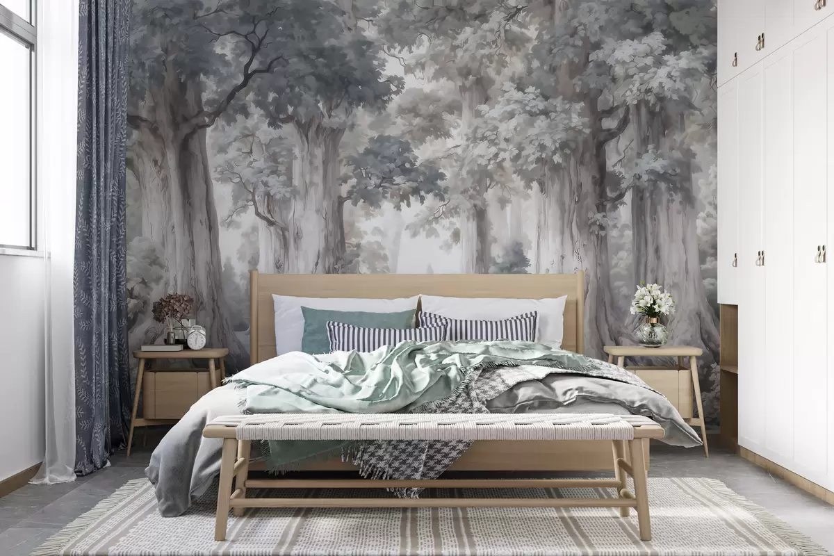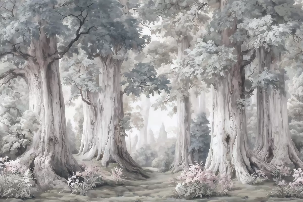 Fototapet O pădure de basm, cu copaci înalți și o paletă de culori delicate, în stil acuarelă Nr. w09849