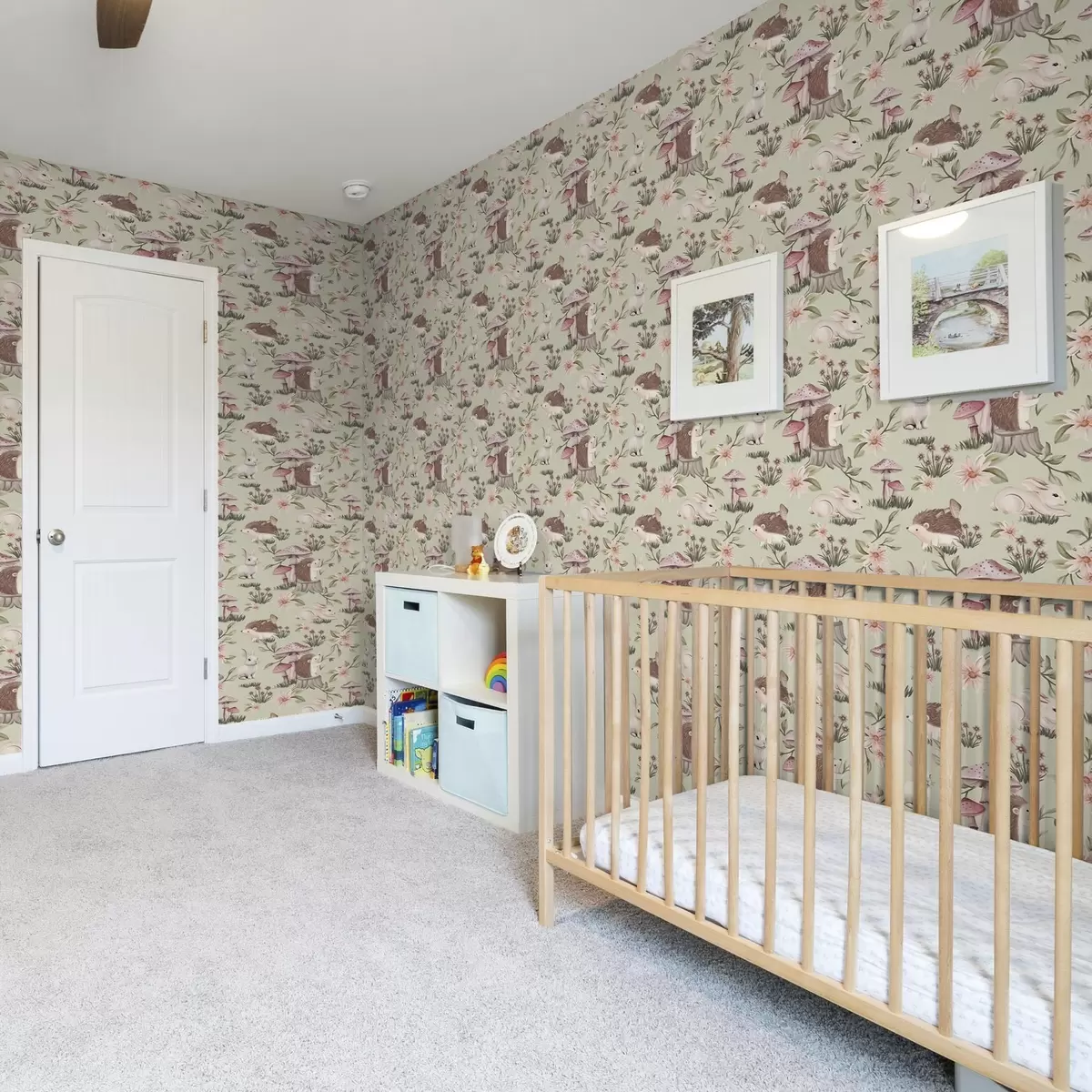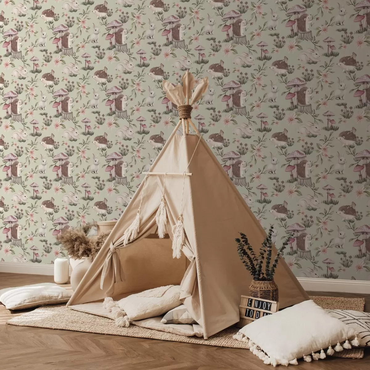 Tapet Animale de basm și flori pe un fundal verde în culori pastelate delicate Nr. a00111v1
