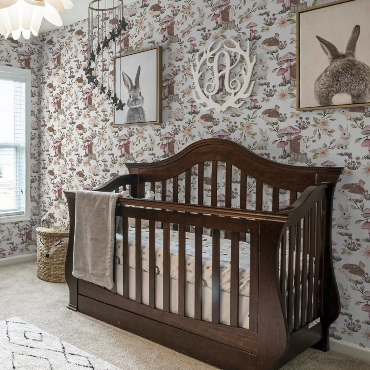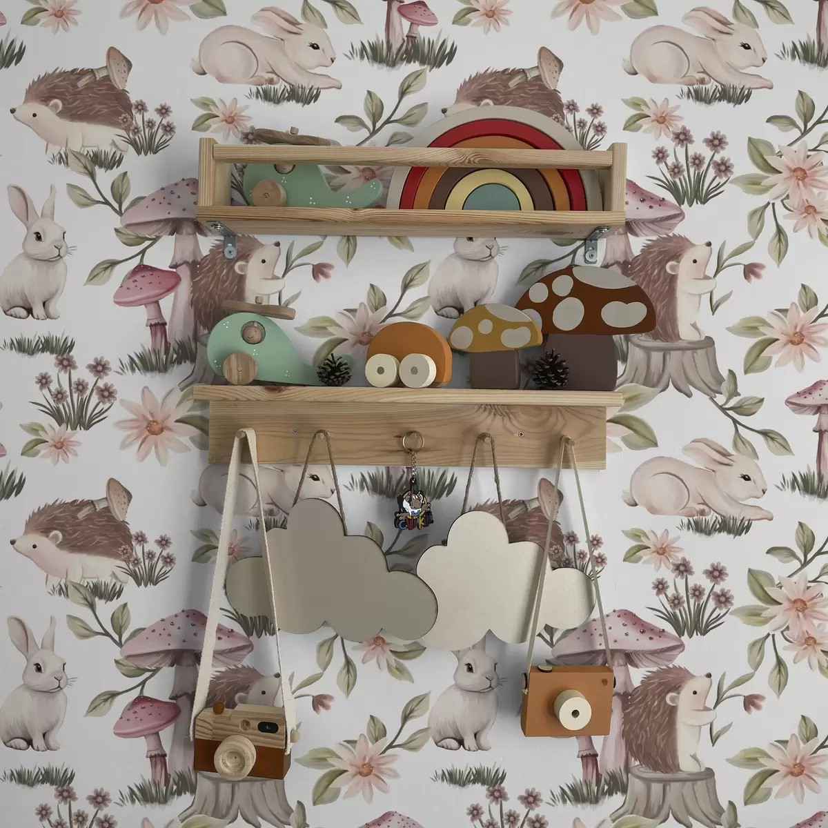 Tapet Arici și iepuri pe fundal alb cu flori delicate și ciuperci Nr. a00111v2