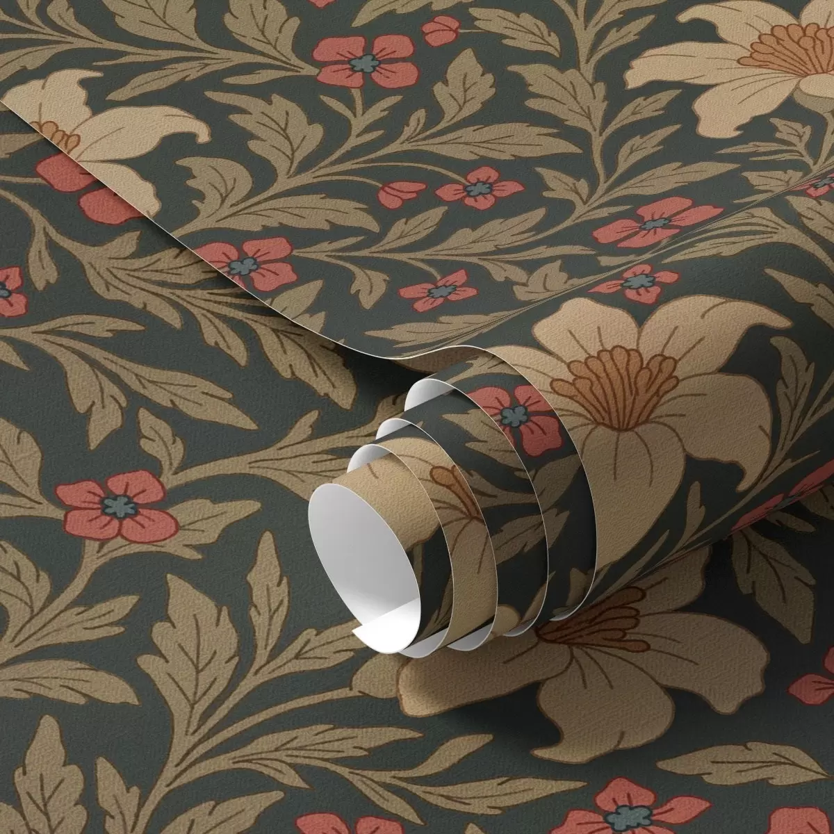 Tapet Fundal închis cu flori galbene și roșii în stil Art Nouveau Nr. a00293