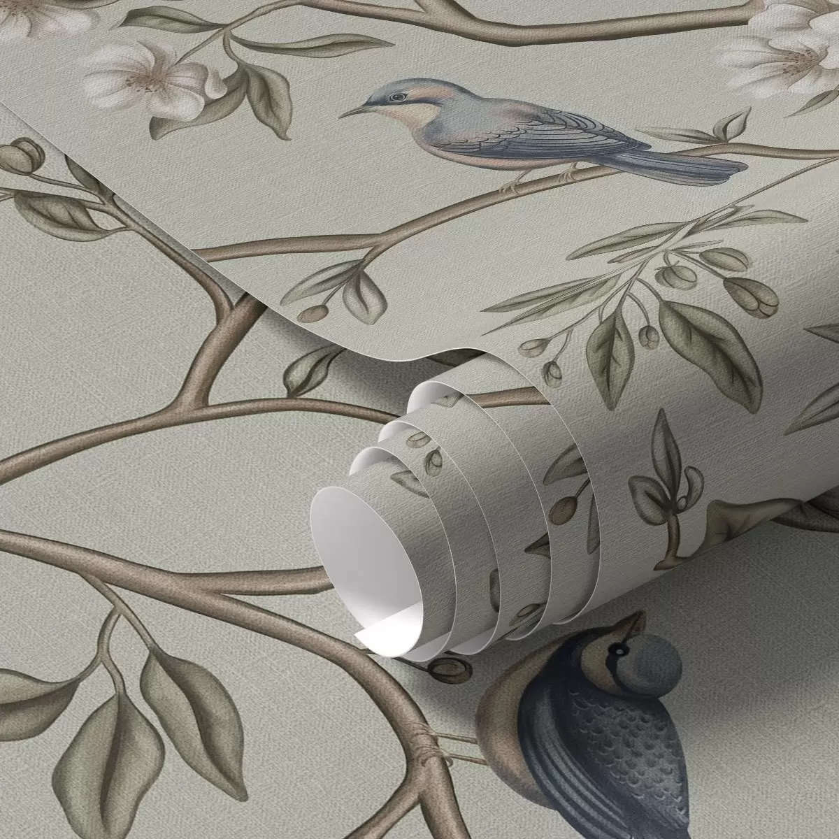 Tapet Ramuri cu păsări și flori albe pe un fundal delicat Nr. a00303