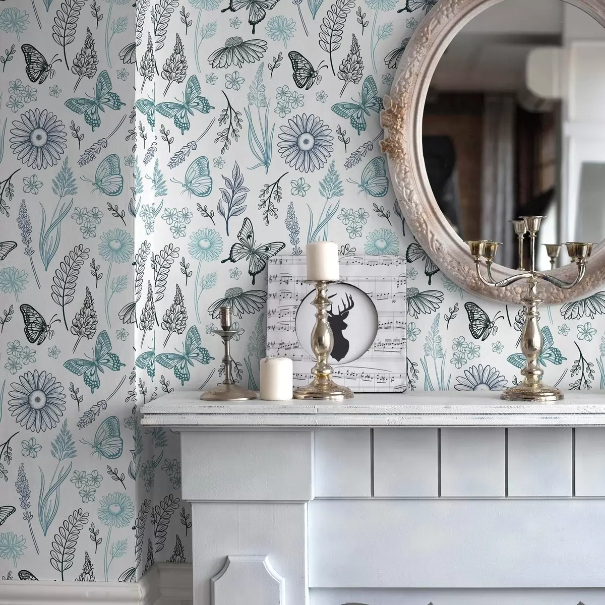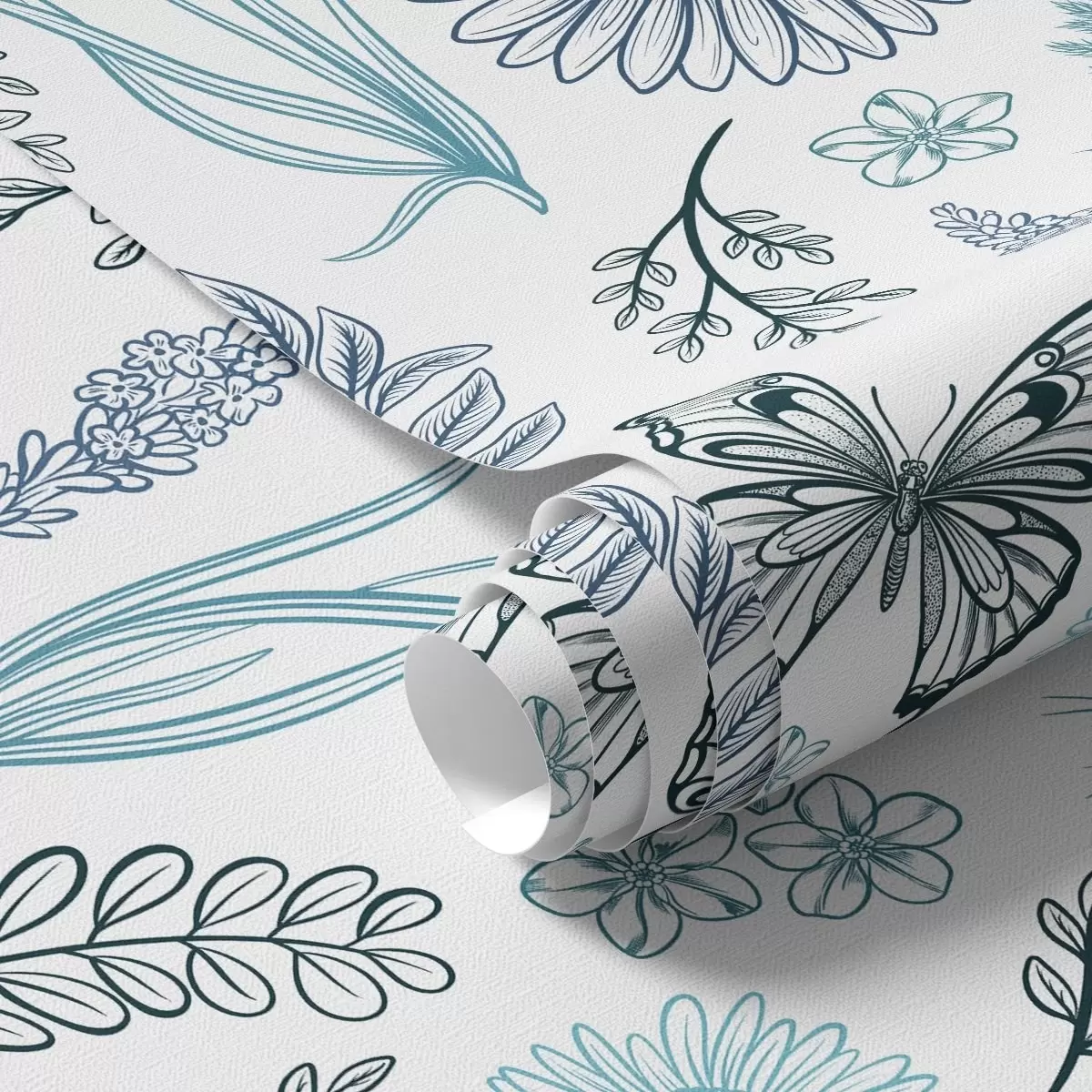 Wallpaper Conturați fluturi și flori în tonuri de albastru și albastru a00311