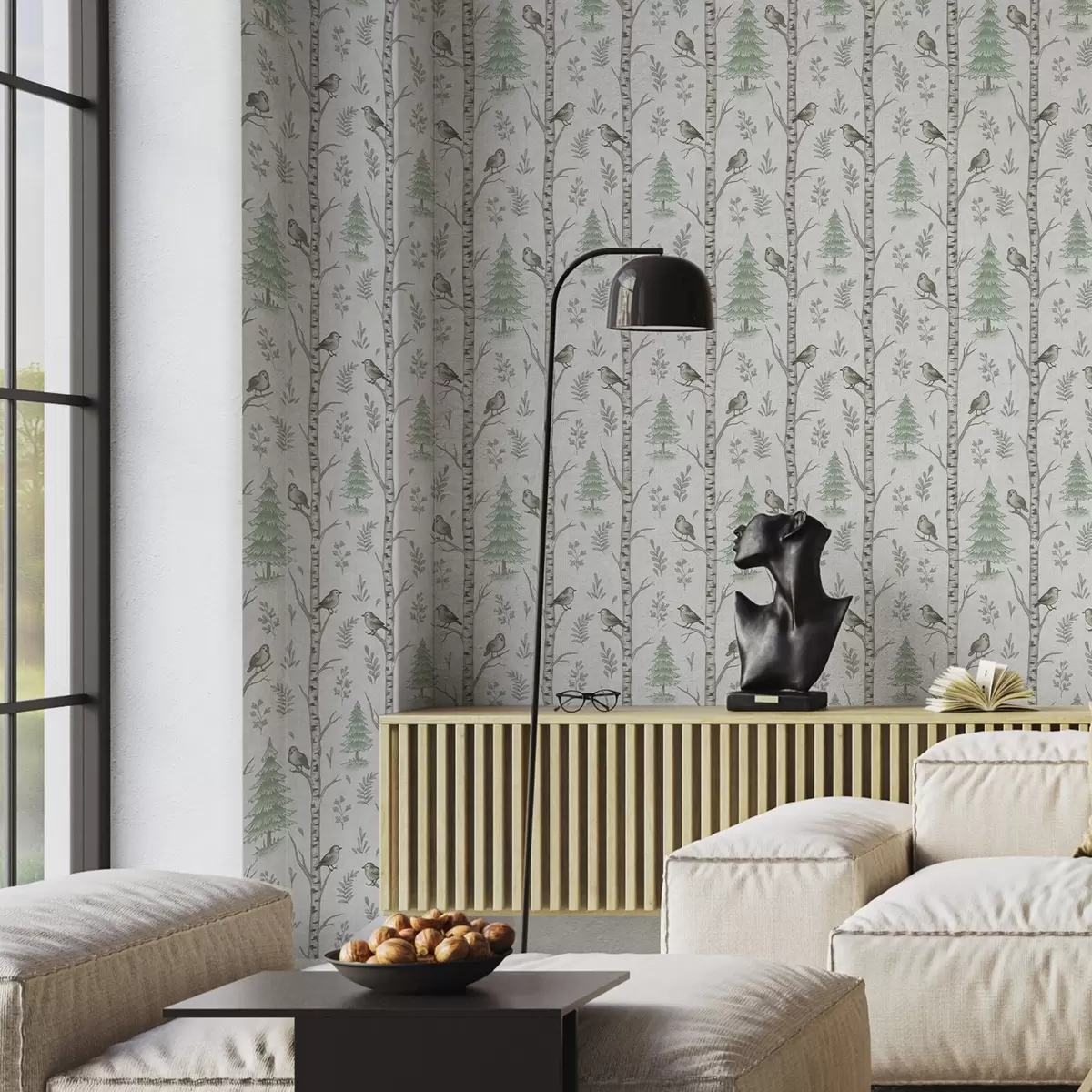 Tapet Merișor cu păsări într-o pădure verde deschis Nr. a00316