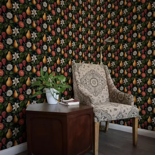 Wallpaper Fructe și flori baroce pe un fundal întunecat dramatic a00387
