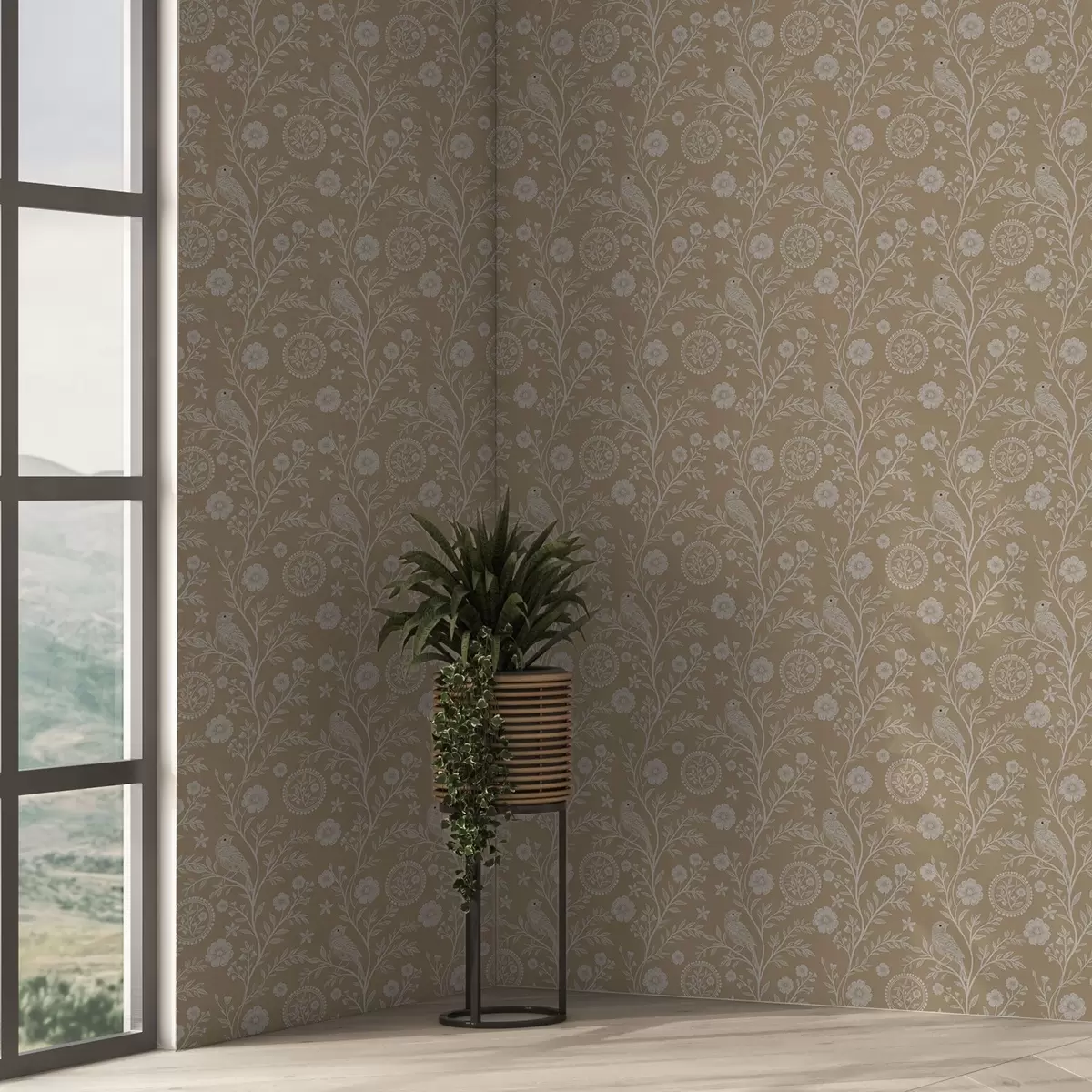 Tapet Schiță delicată a unei păsări albe și floare pasăre albă și floare pe fundal ocru Nr. a00393