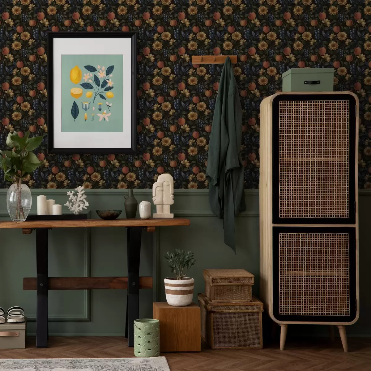 Tapet Fructe și flori galbene pe fundal botanic întunecat Nr. a00395