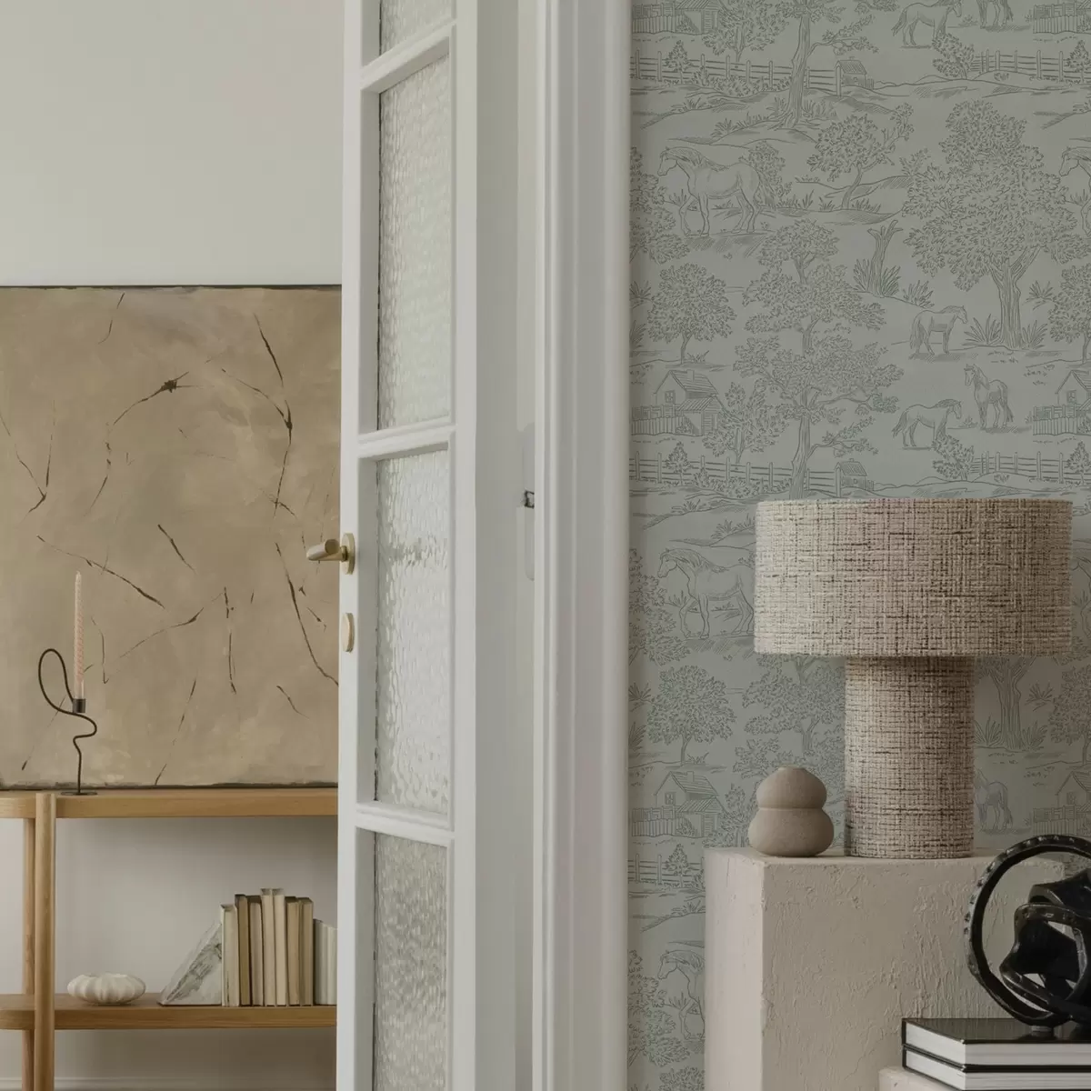 Tapet Peisaj verde monocrom cu cai și căsuțe Nr. a00407
