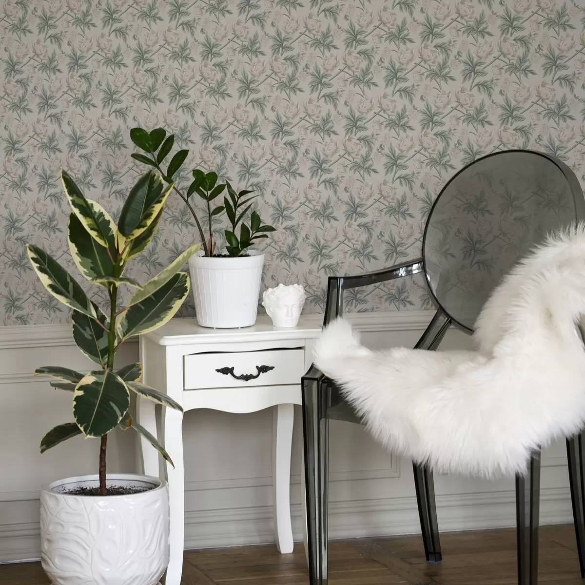 Tapet Bujori luxuriante în bej deschis și verde bej și verde Nr. a00445