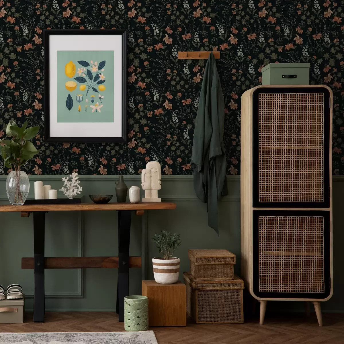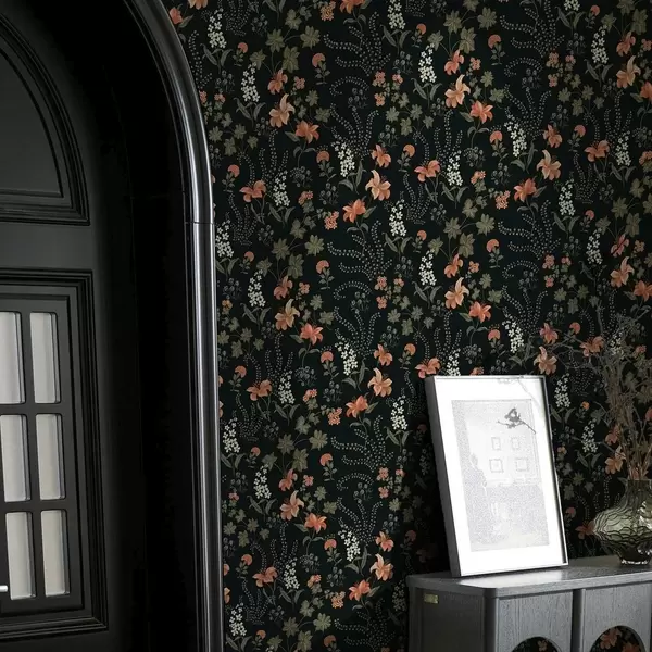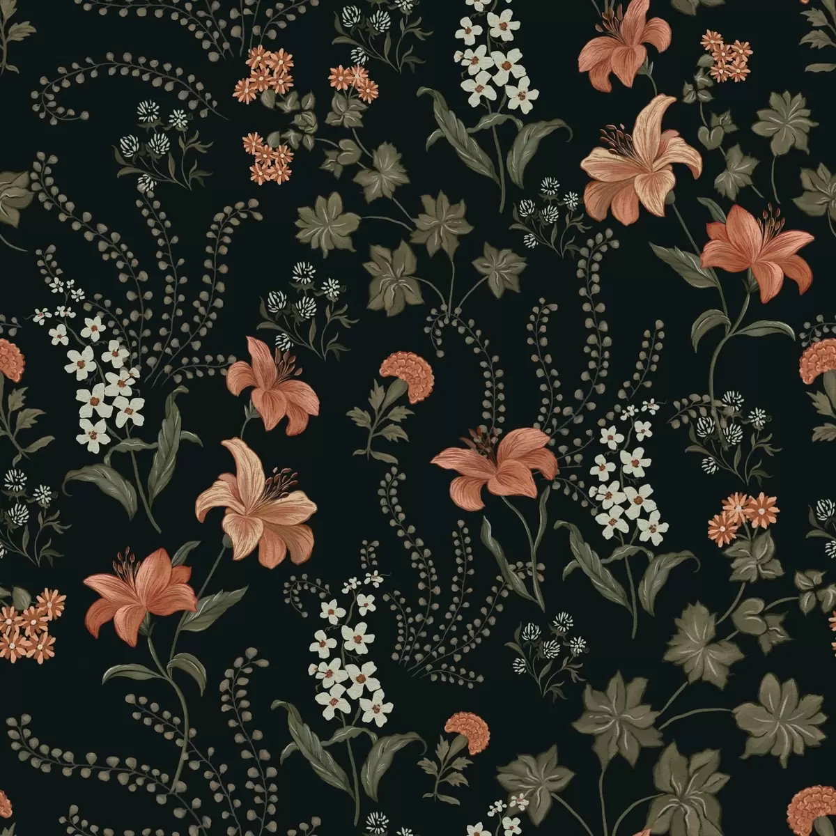 Tapet Crini portocalii și flori mici pe un fundal negru Nr. a00463