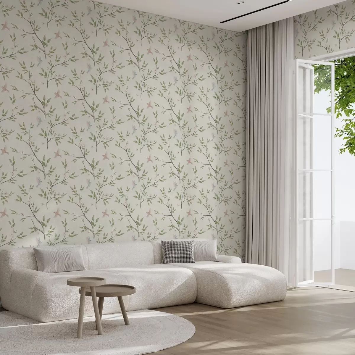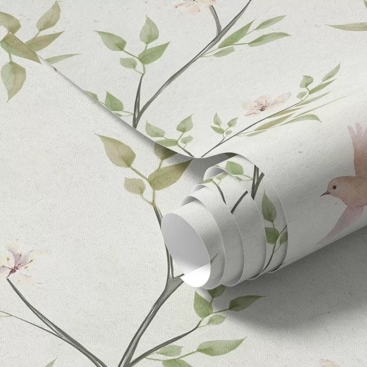 Tapet Ramuri pictate în acuarelă cu frunze și păsări pe un fundal deschis Nr. a00496