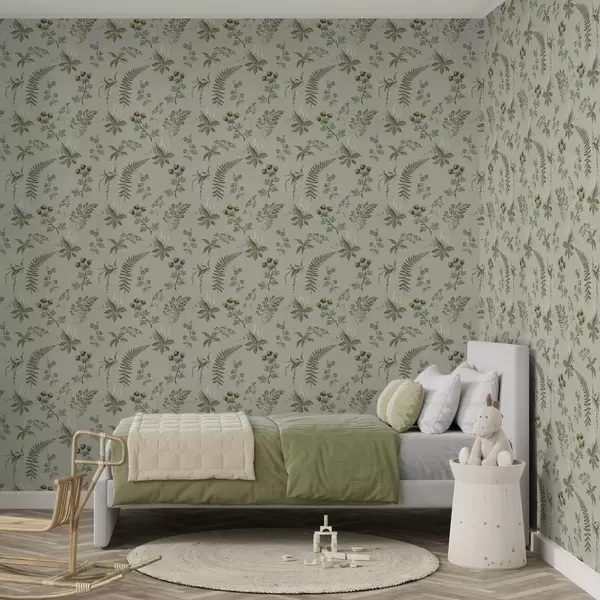 Tapet Ierburi botanice și ferigi pe fond gri-verzui pal Nr. a00498