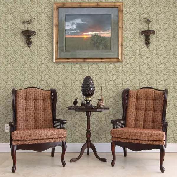 Tapet Ornament vintage cu volute și flori, bej și măslin Nr. a00574