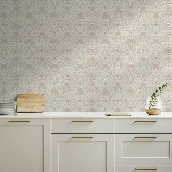 Wallpaper Stilul Morris: bujori și ierburi în nuanțe delicate de bej-verde a00581