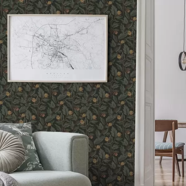 Wallpaper Model floral închis la culoare, cu muguri și frunze galbene a00598
