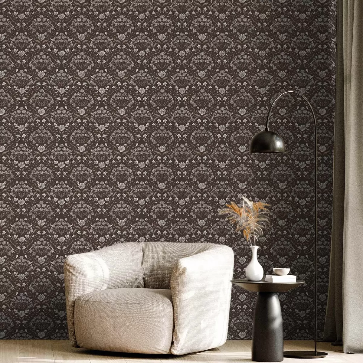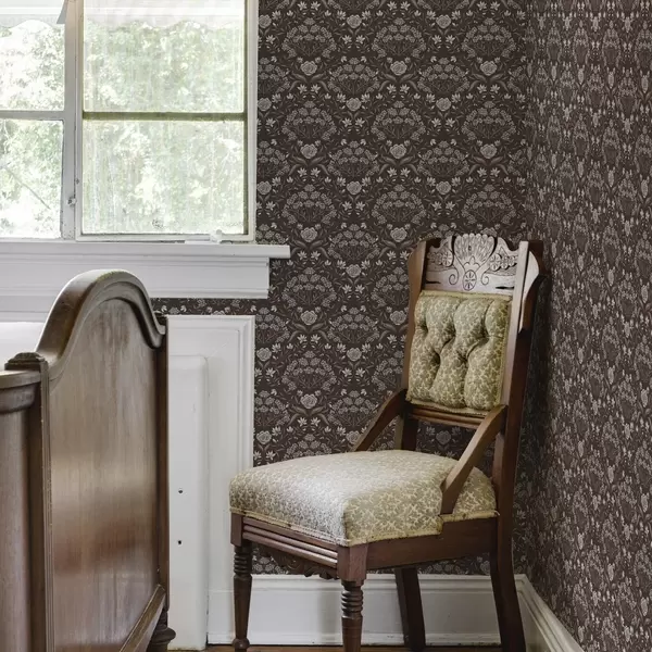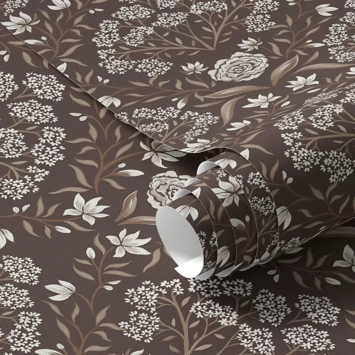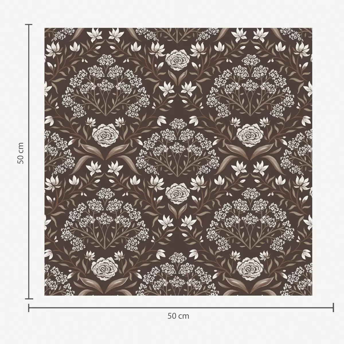 Tapet Damasc din ciocolată neagră cu bujori și ghiocei Nr. a00603v2