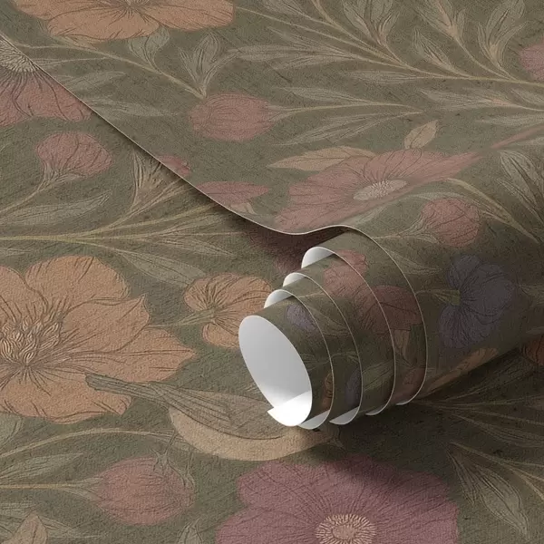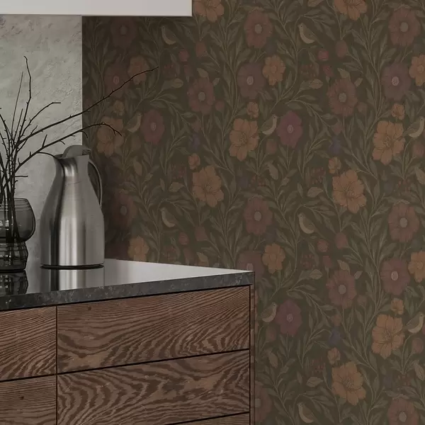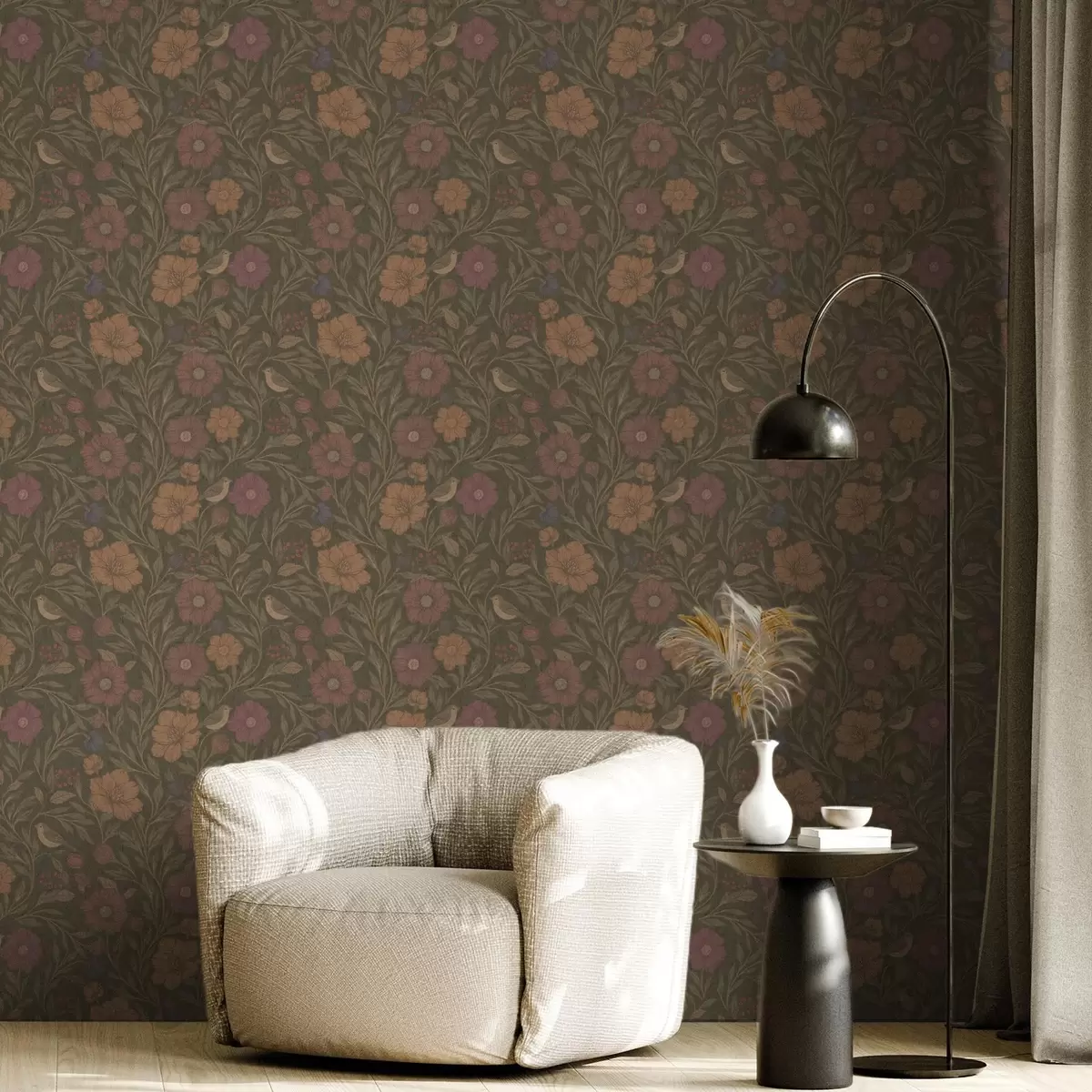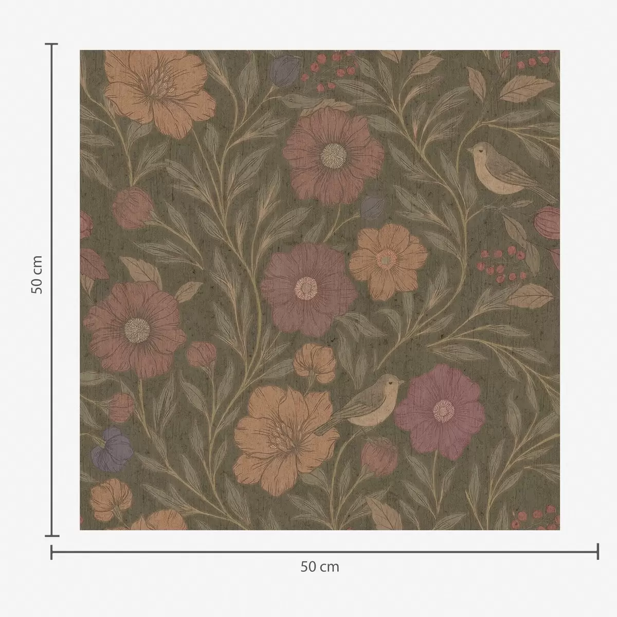 Tapet Flori de toamnă și păsări pe fundal maro-măsliniu Nr. a00605