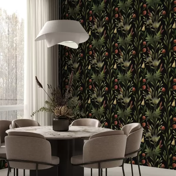Tapet Ierburi înalte și flori pe fond negru, imprimeu detaliat Nr. a00620