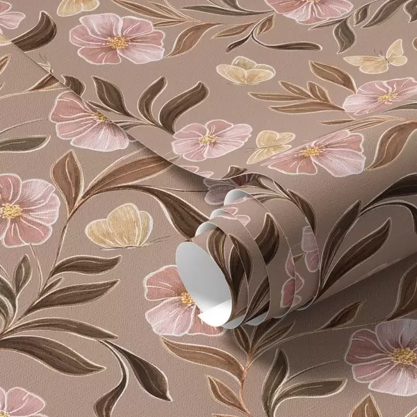 Tapet Flori roz și fluturi pe un fundal maro cald Nr. a00633v1
