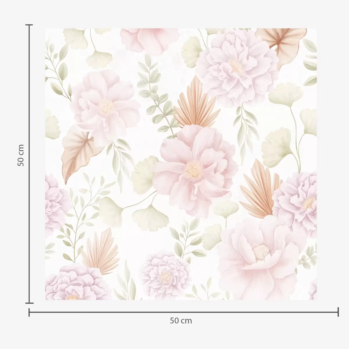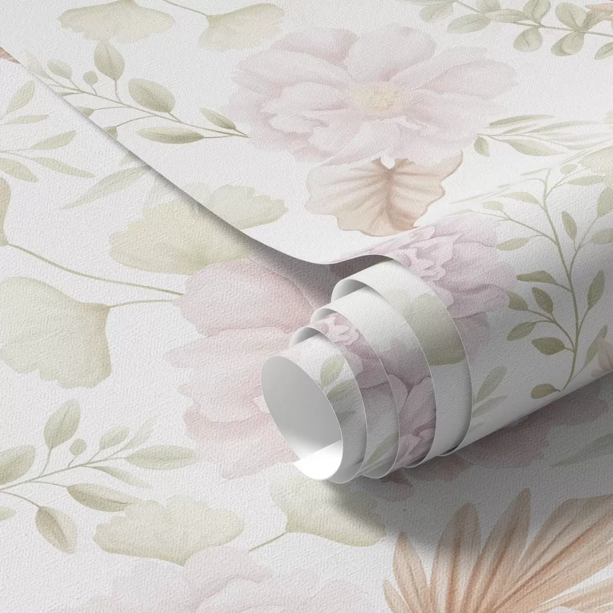 Tapet Bujori și frunze în culori pastelate delicate pe fond alb Nr. a00669