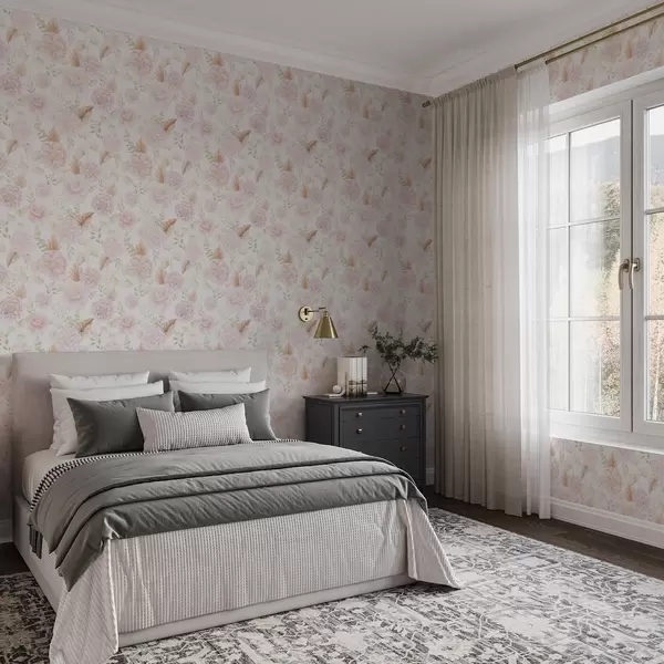 Tapet Bujori și frunze în culori pastelate delicate pe fond alb Nr. a00669