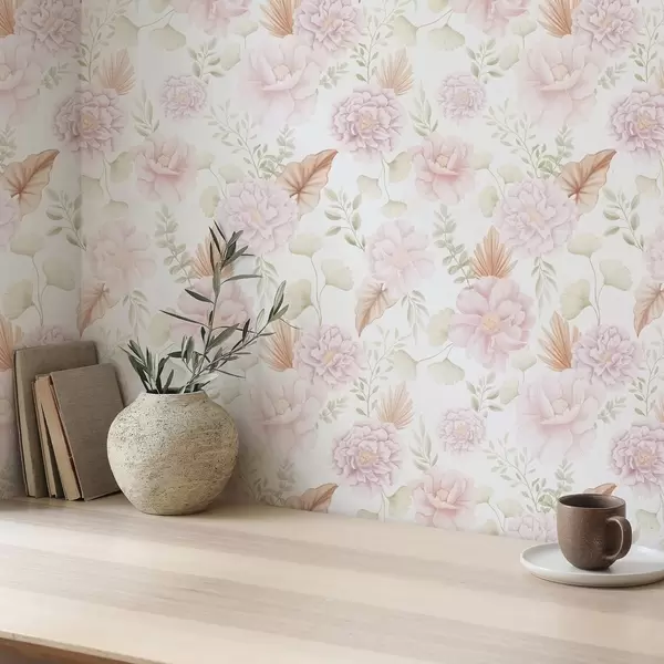 Tapet Bujori și frunze în culori pastelate delicate pe fond alb Nr. a00669