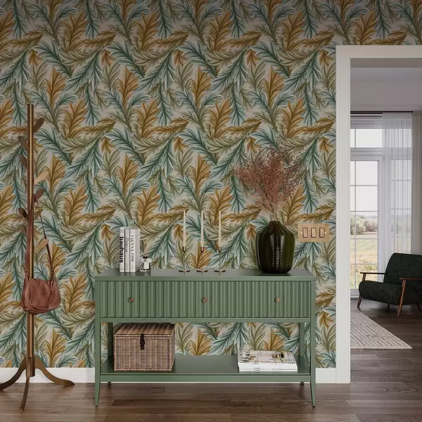 Tapet Frunziș decorativ într-o paletă caldă de ocru și verde Nr. a00673