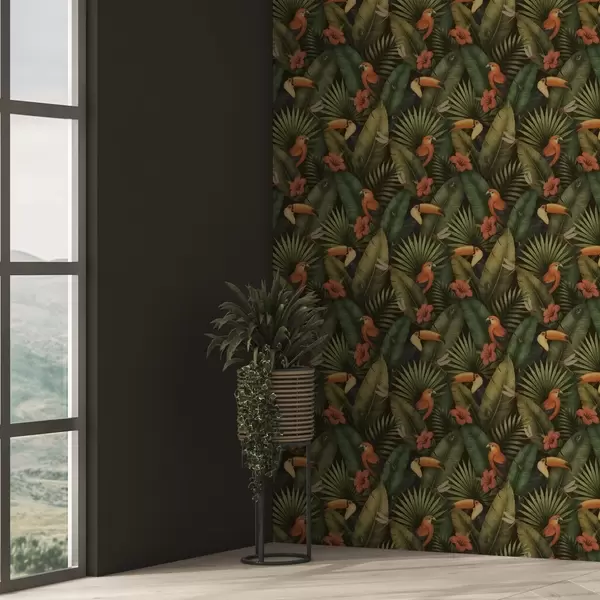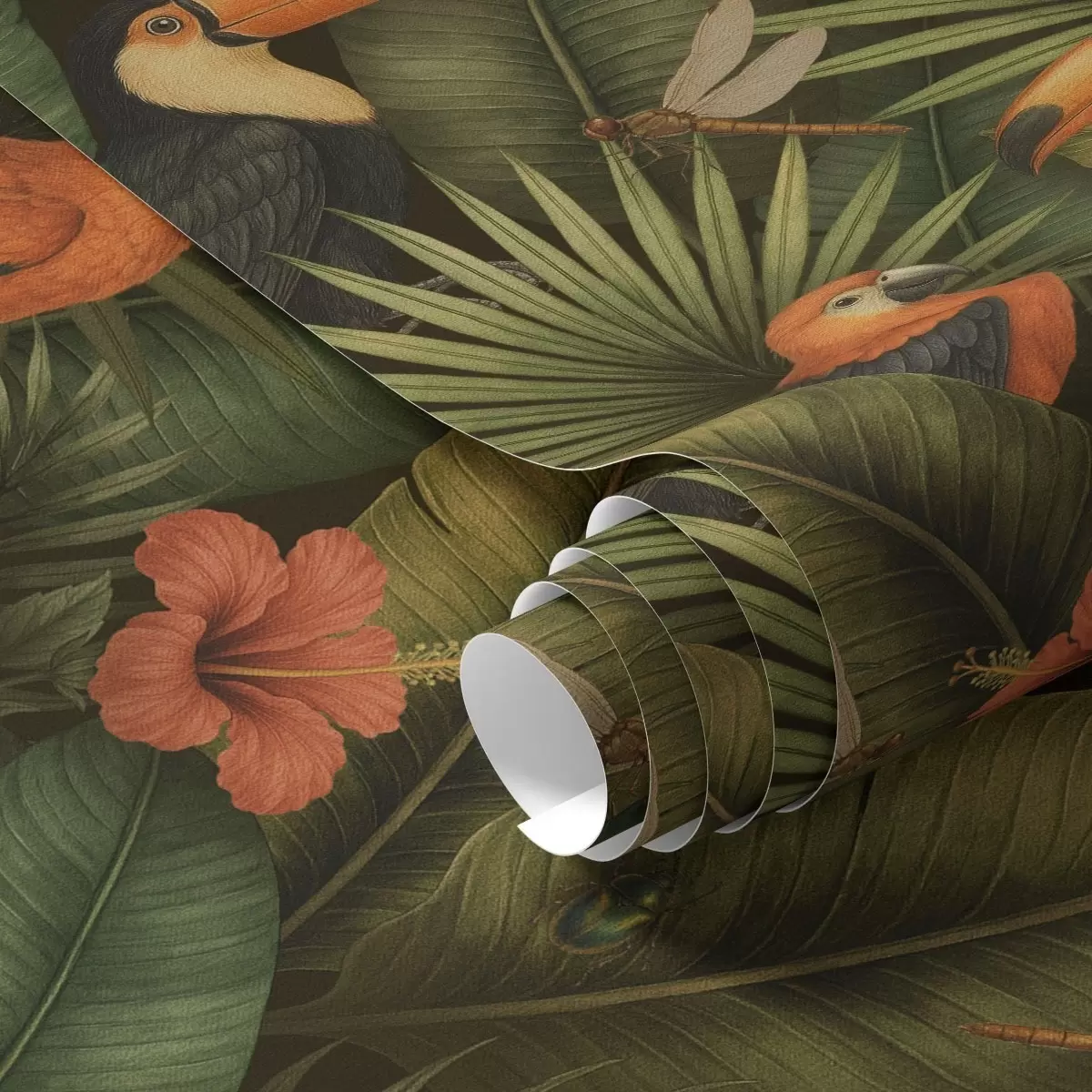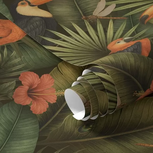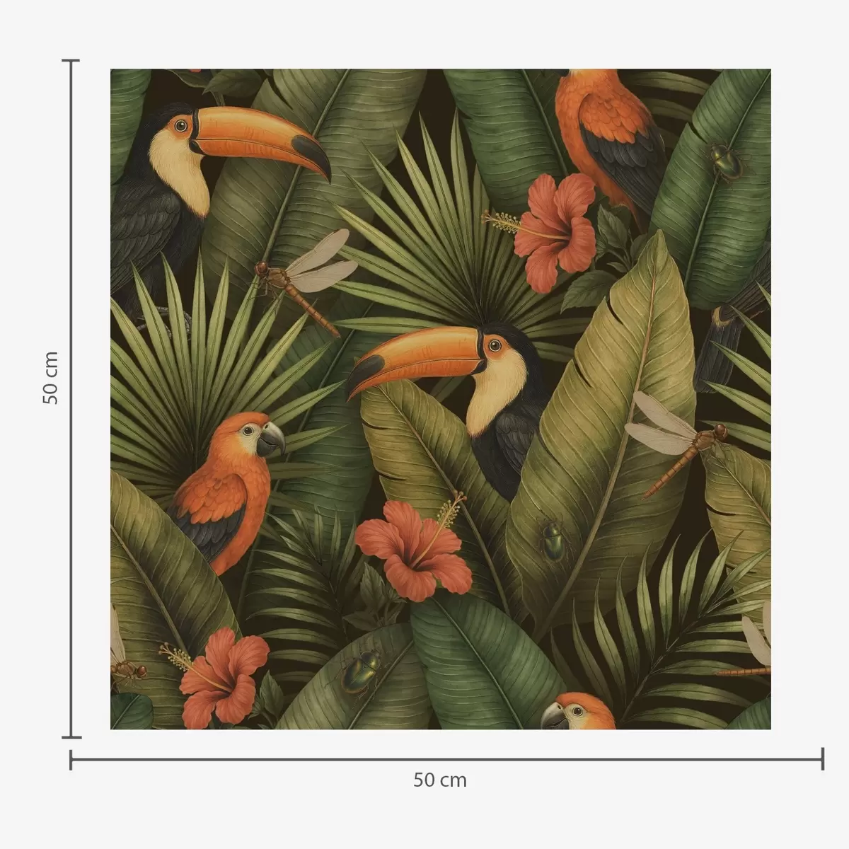 Tapet Tucani și papagali printre frunzișul tropical și flori Nr. a00702