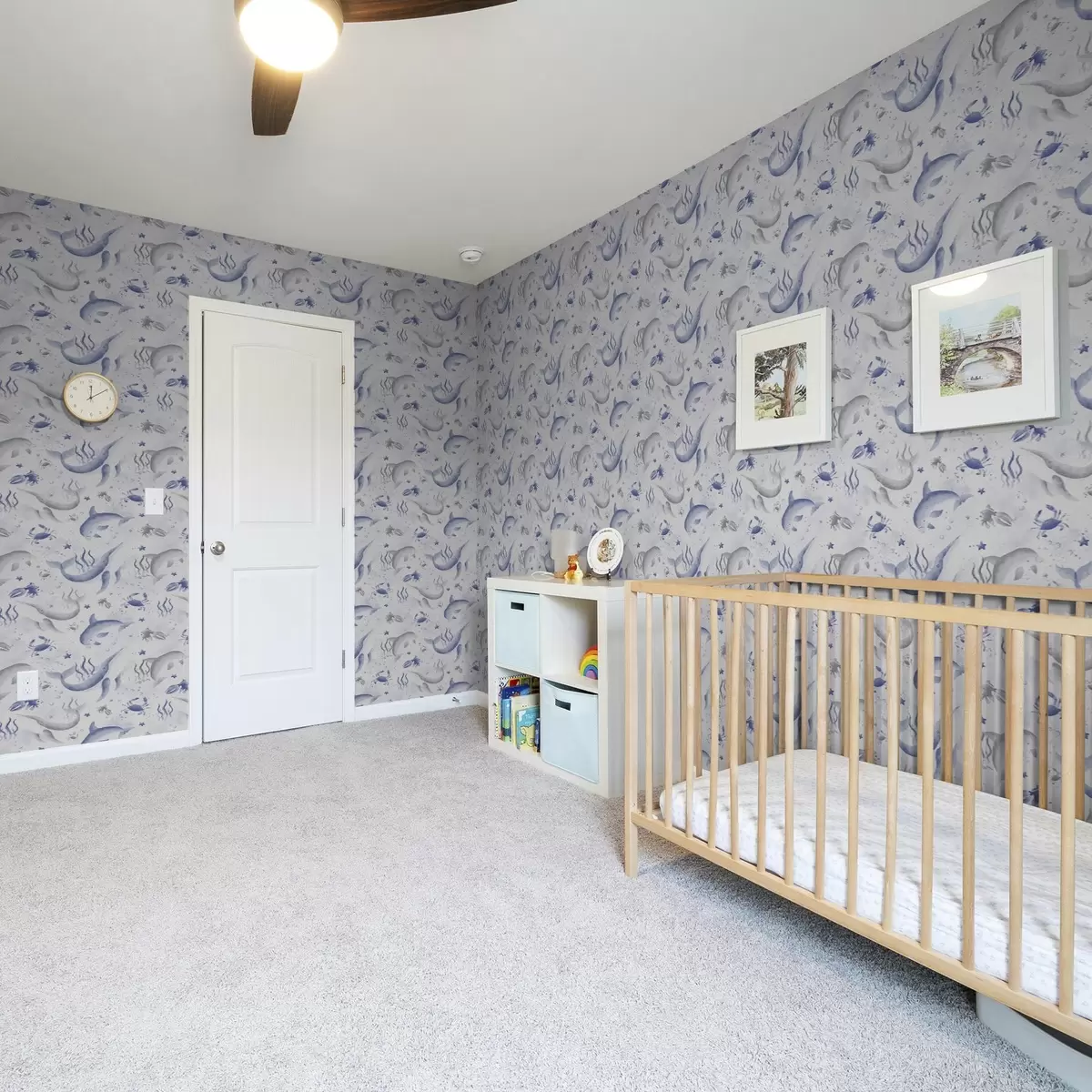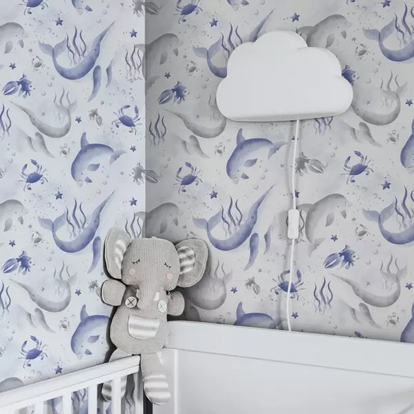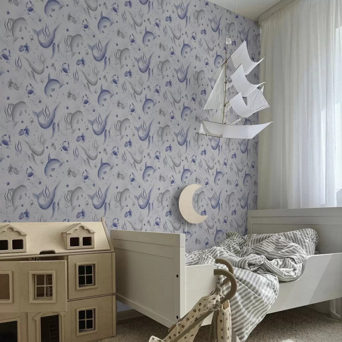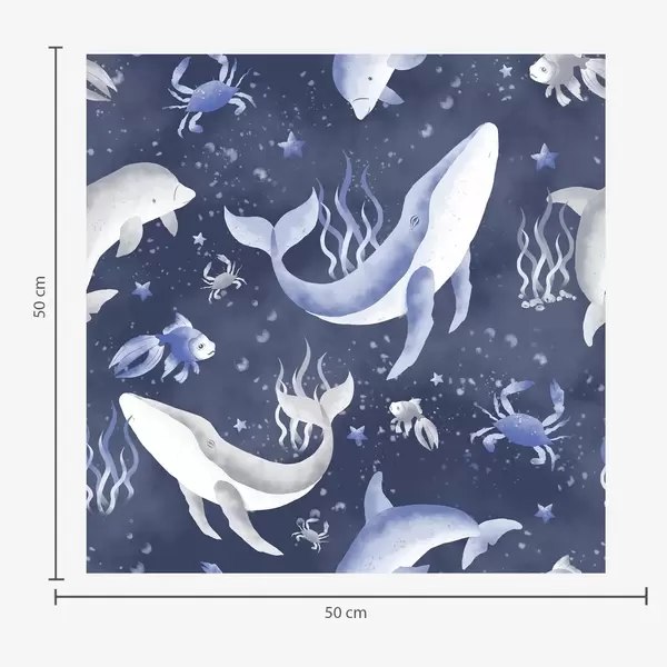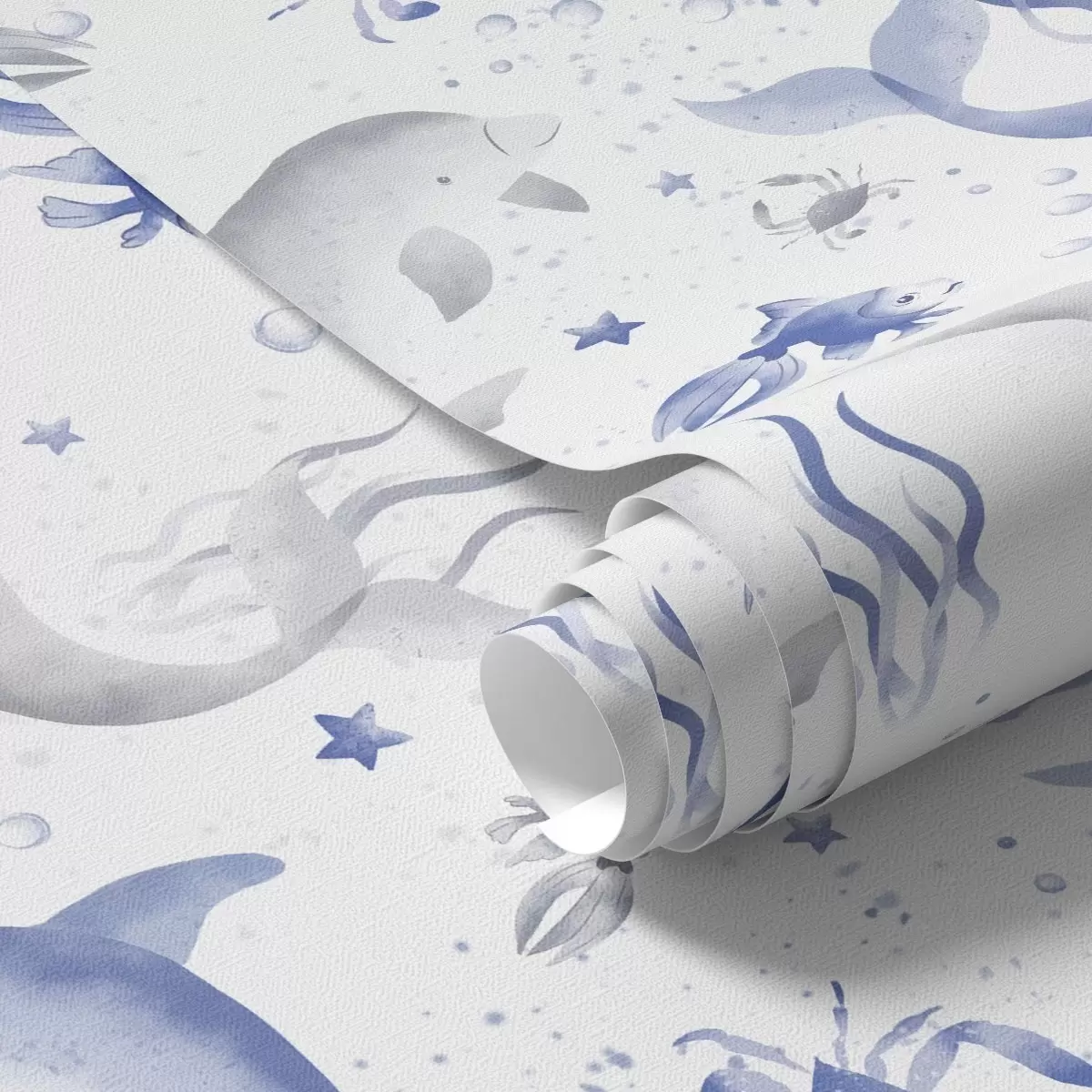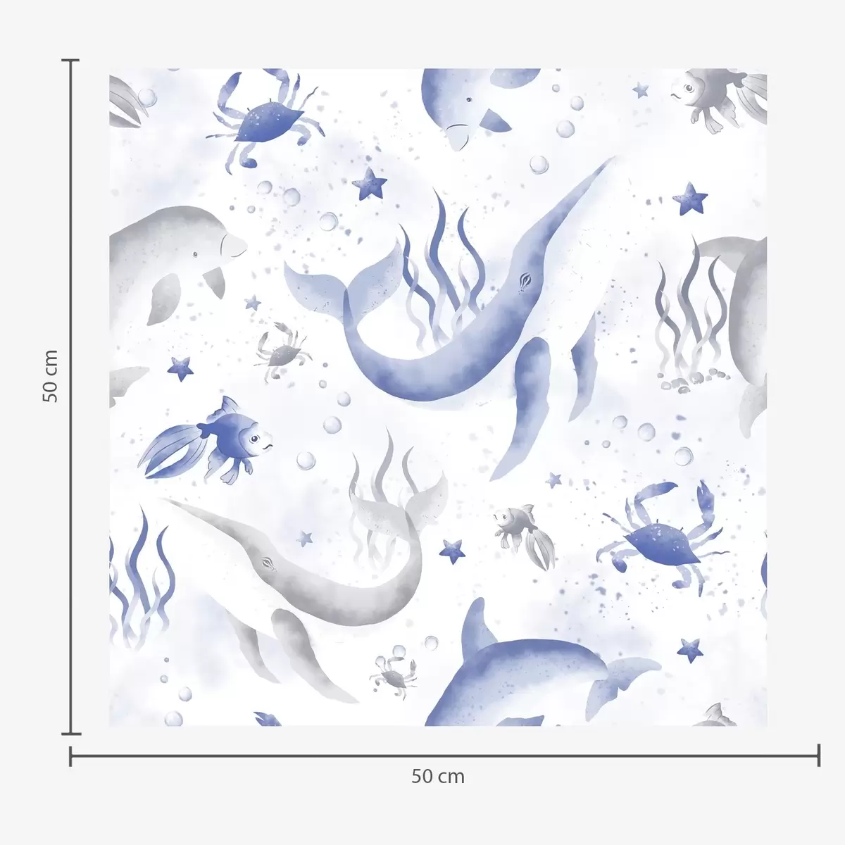 Tapet Balenele și delfinii marini în tonuri de albastru pe fond alb Nr. a00720v1