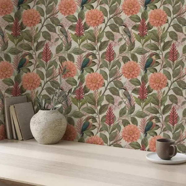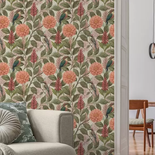 Tapet Păsări printre flori și frunze în tonuri calde Nr. a00753