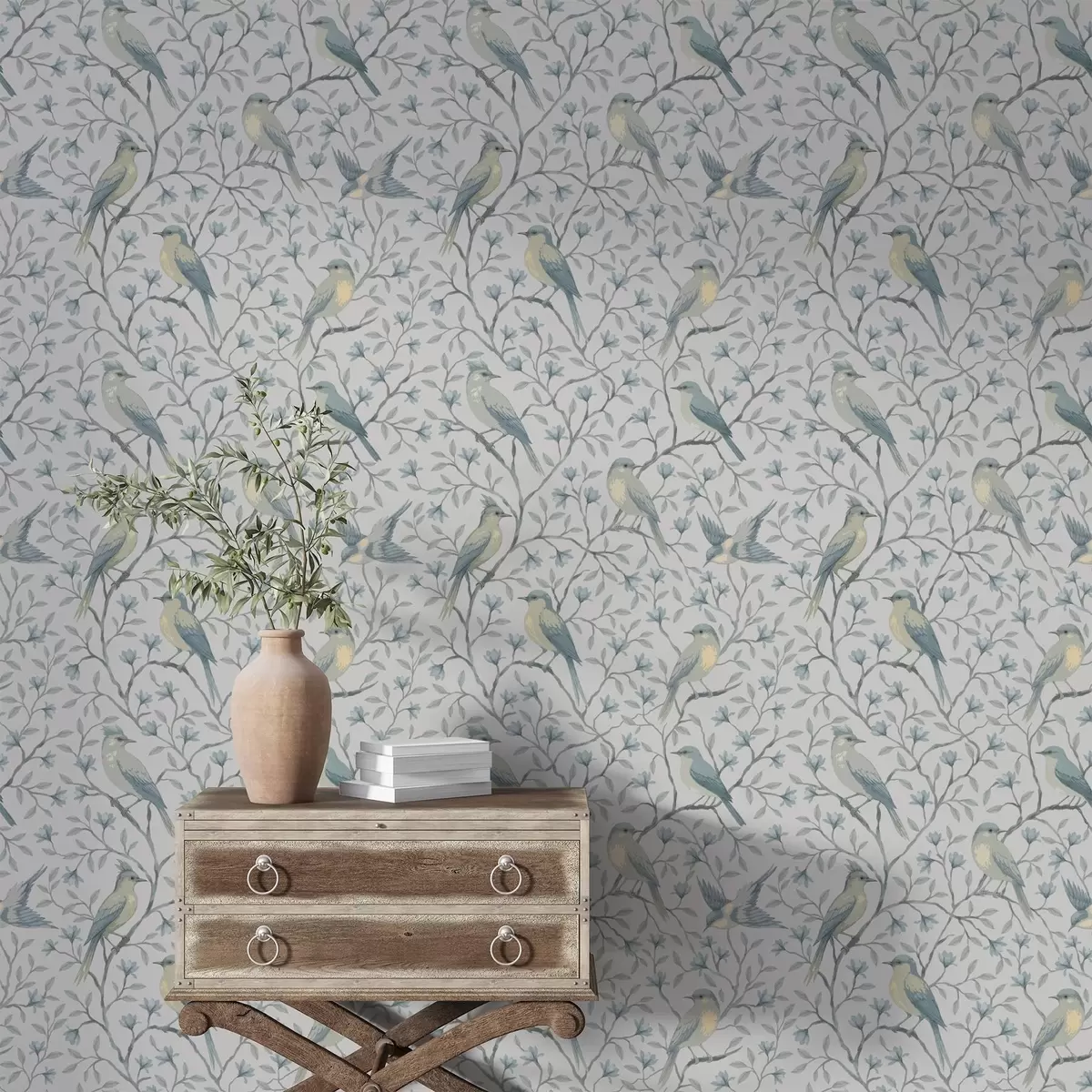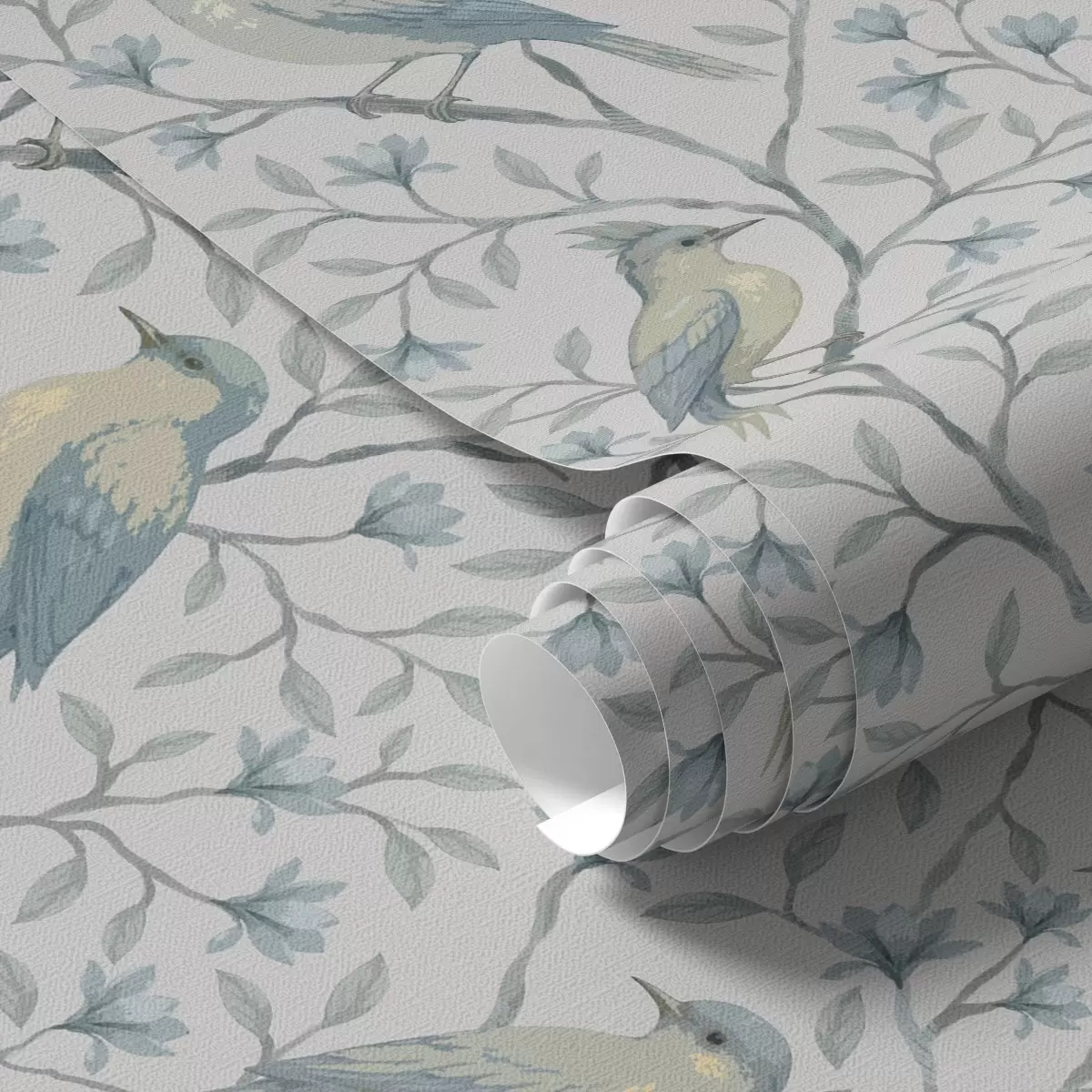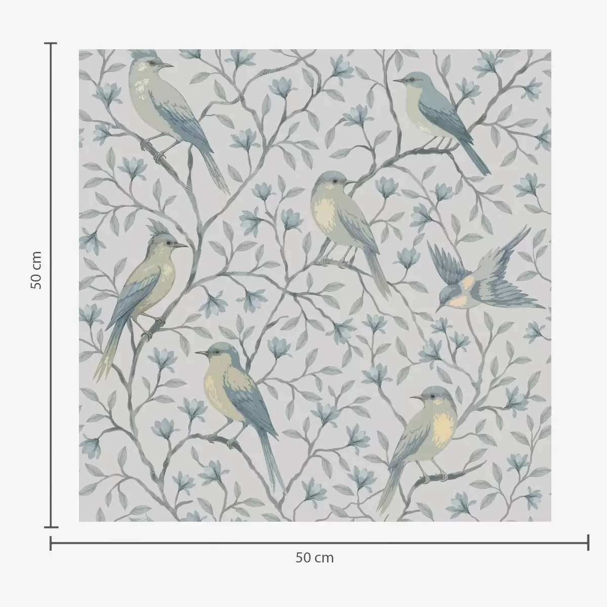 Tapet Păsări pe crengi, schemă de culori gri-albastru Nr. a00782