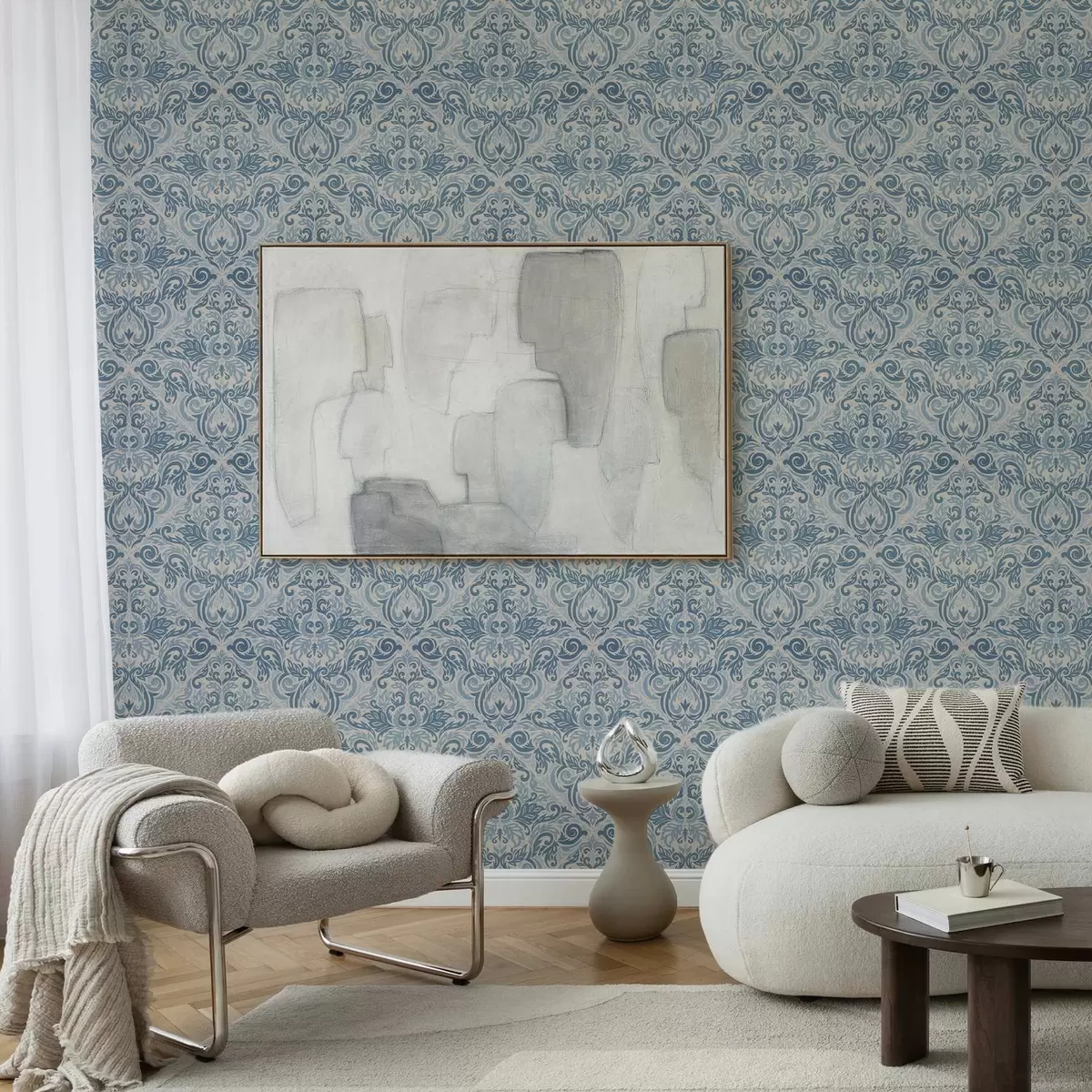 Wallpaper Damasc clasic, motive albastre pe fond crem a00826v1