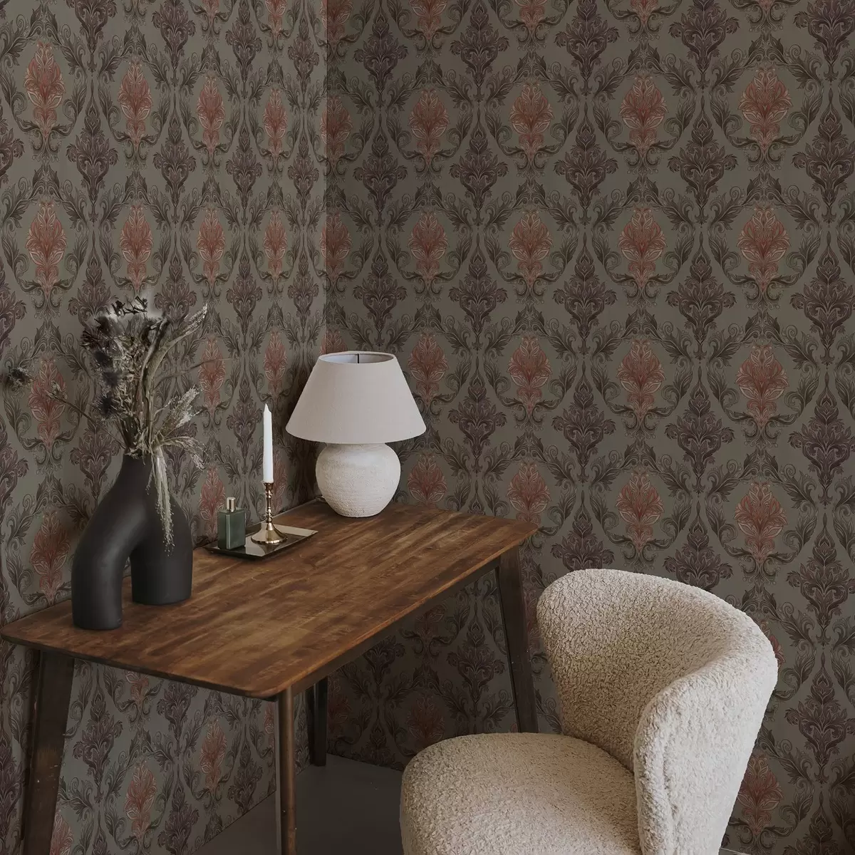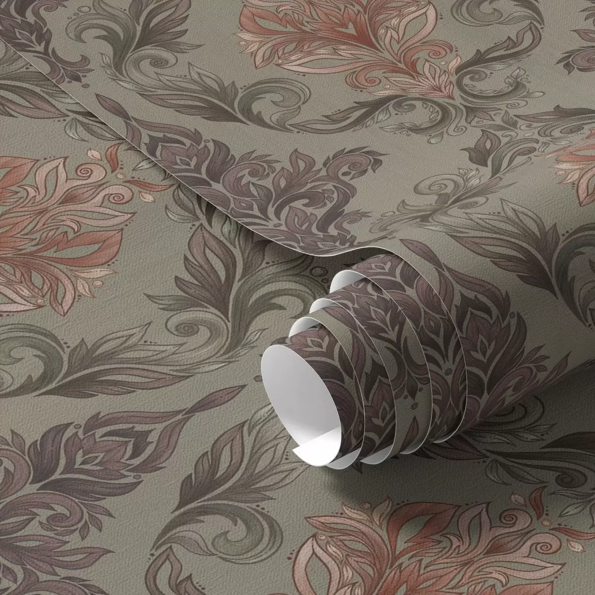 Wallpaper Damasc teracotă pe fond măslin discret a00828v3