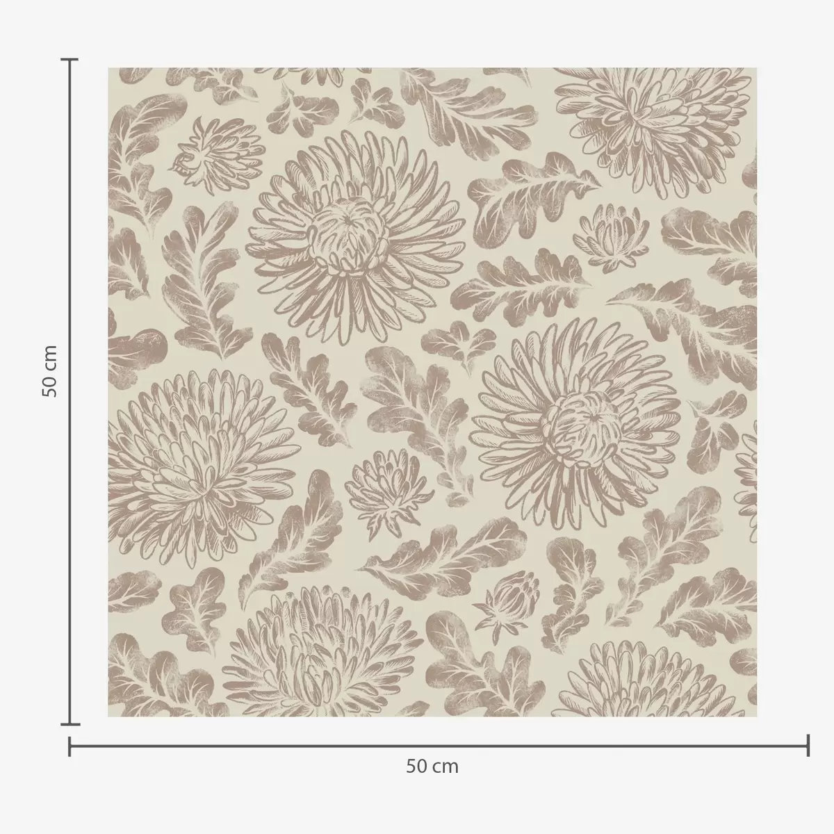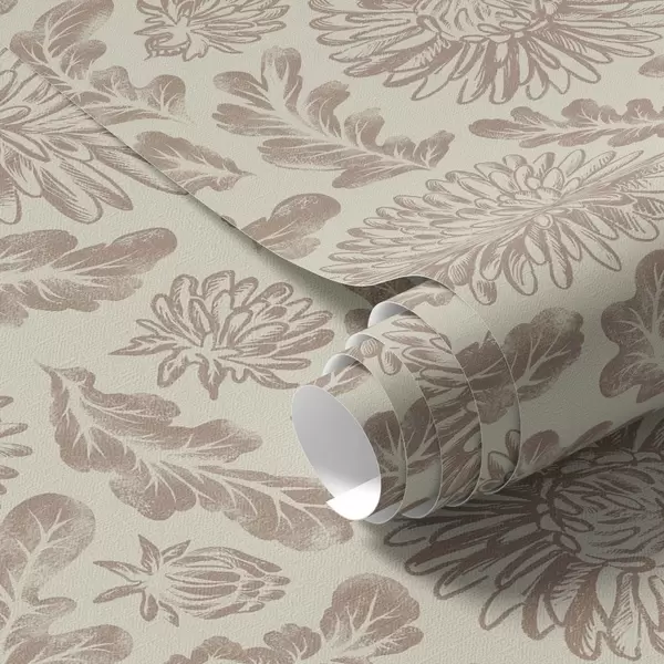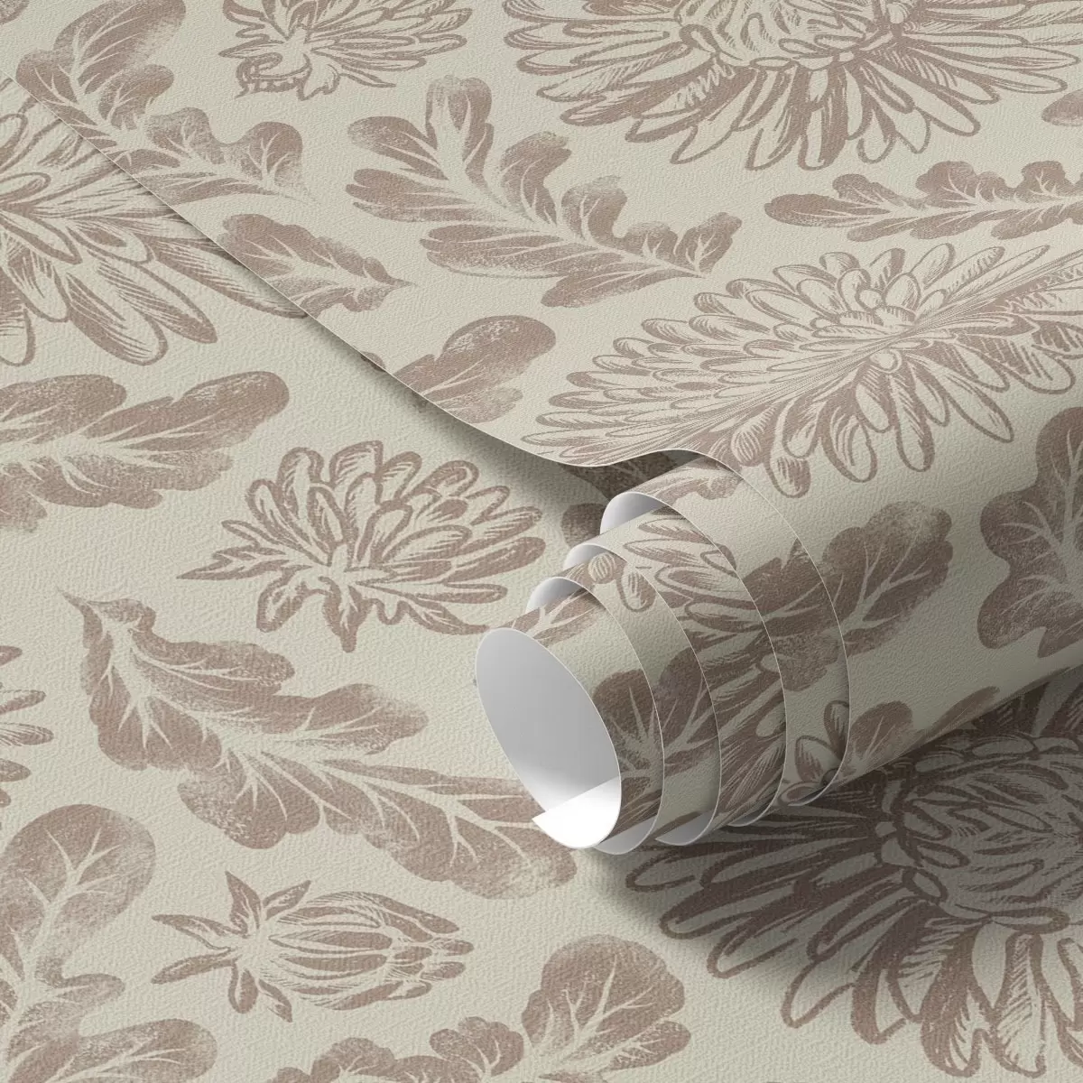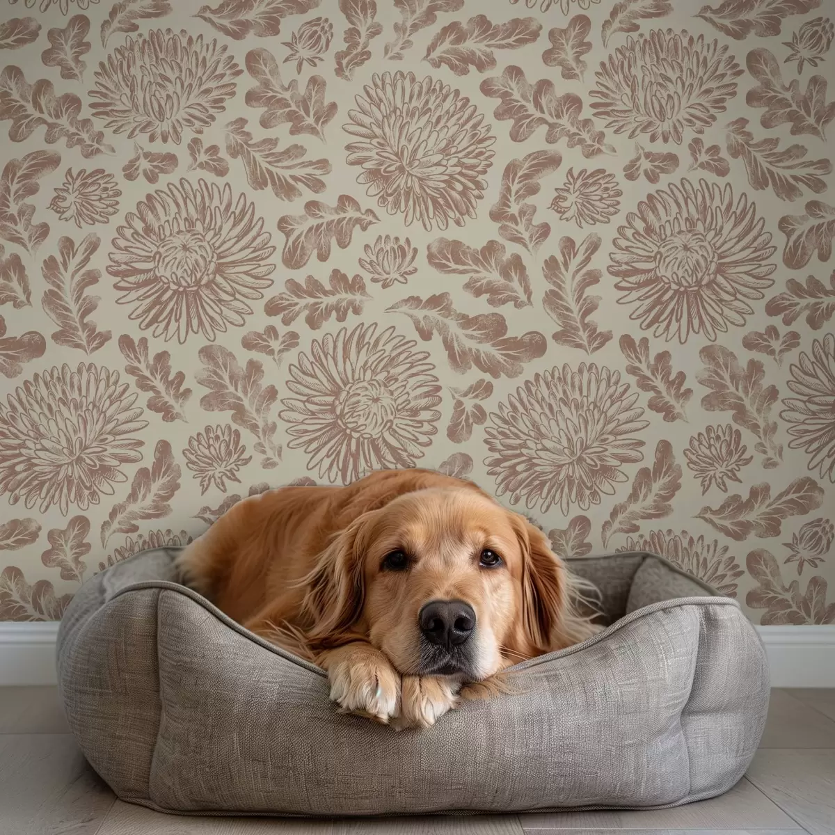 Tapet Crizanteme și frunze de stejar în nuanțe delicate de bej-maro Nr. a00840