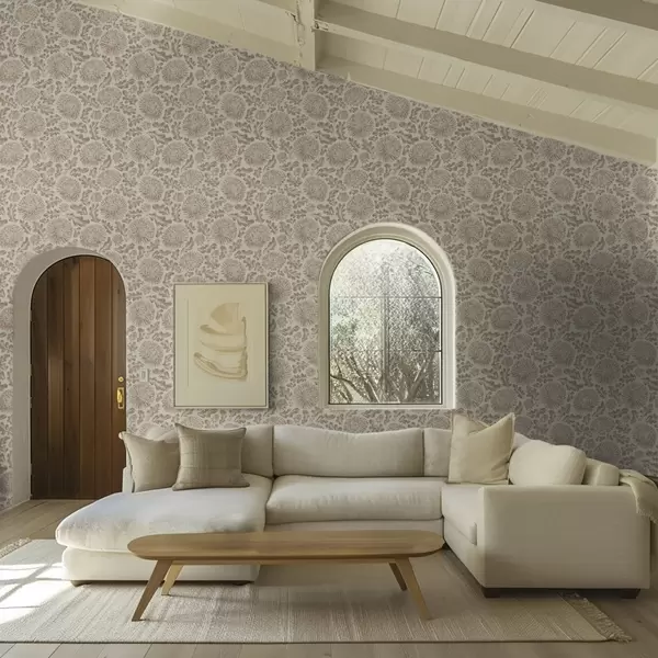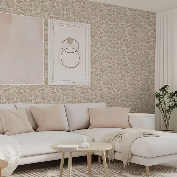 Tapet Crizanteme și frunze de stejar în nuanțe delicate de bej-maro Nr. a00840