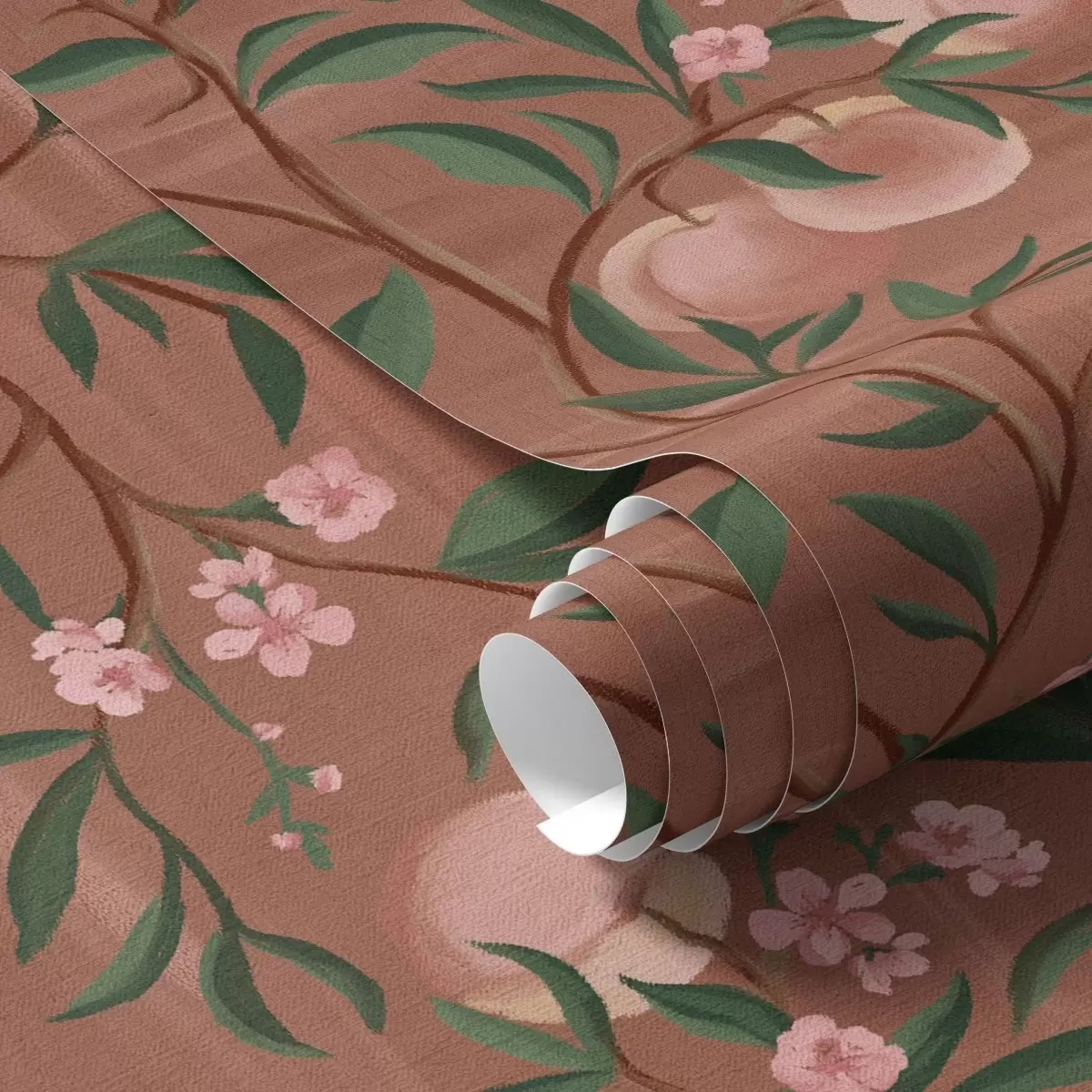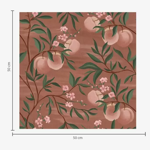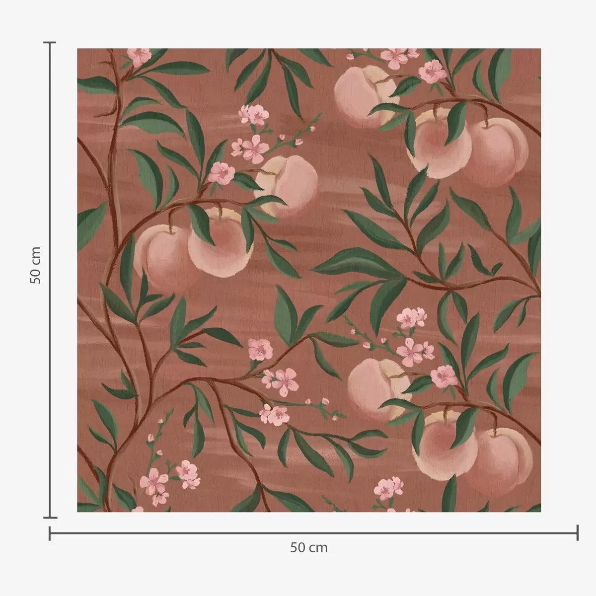 Tapet Piersici pe ramuri cu flori roz, sol teracotă Nr. a00856