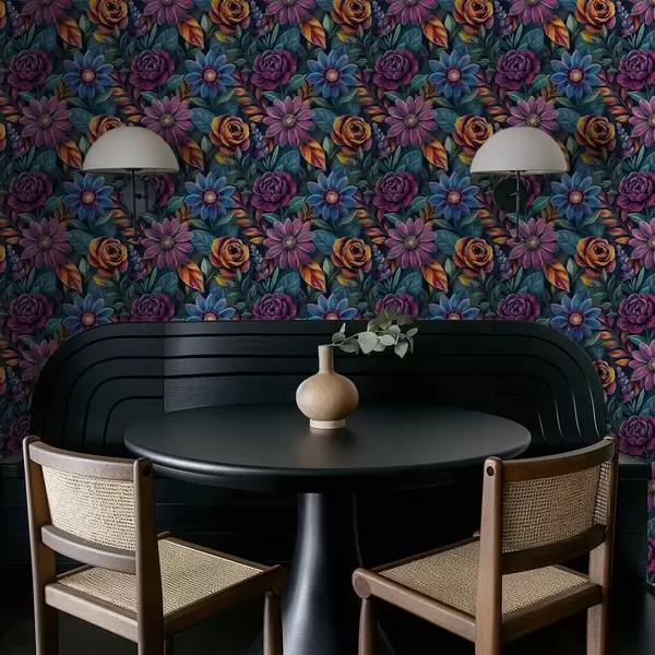 Tapet Flori vibrante în nuanțe de bijuterii pe fond albastru închis Nr. a00871