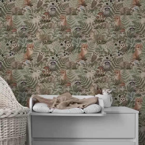 Tapet Animale din pădure, ferigi și ciuperci pe fond bej deschis Nr. a00880v1