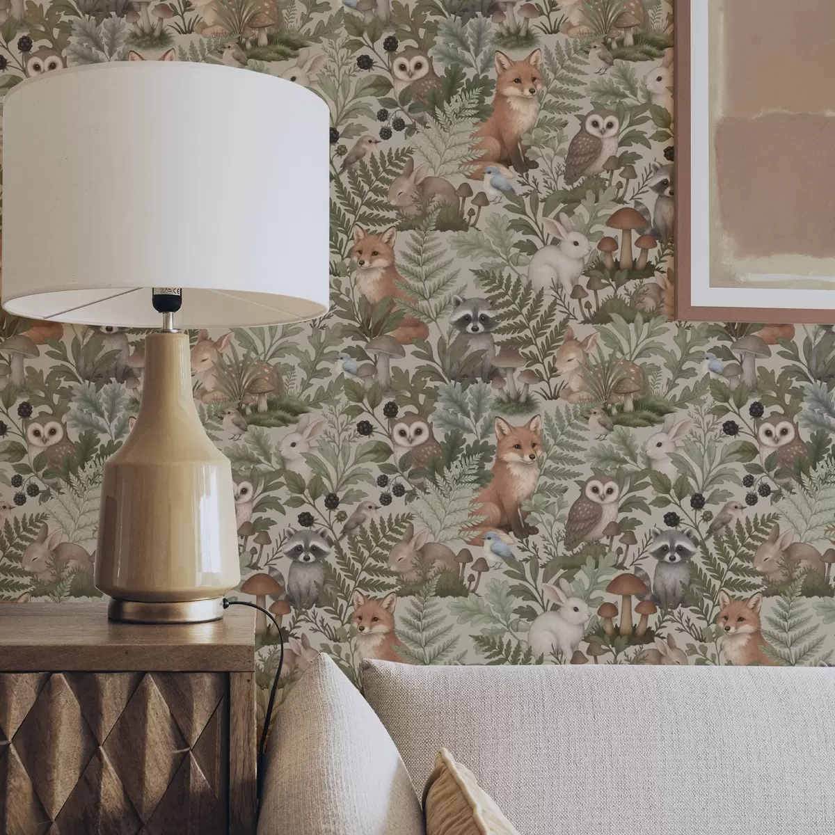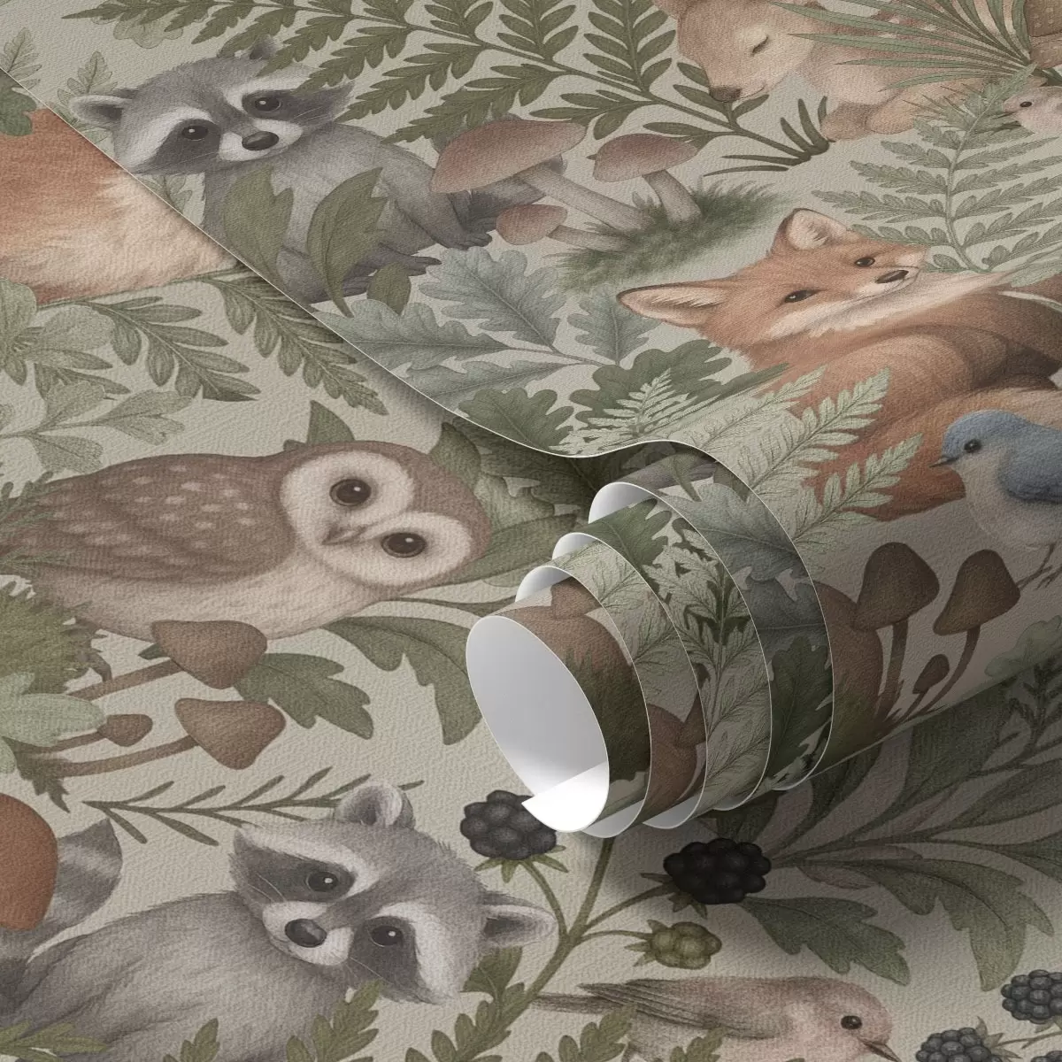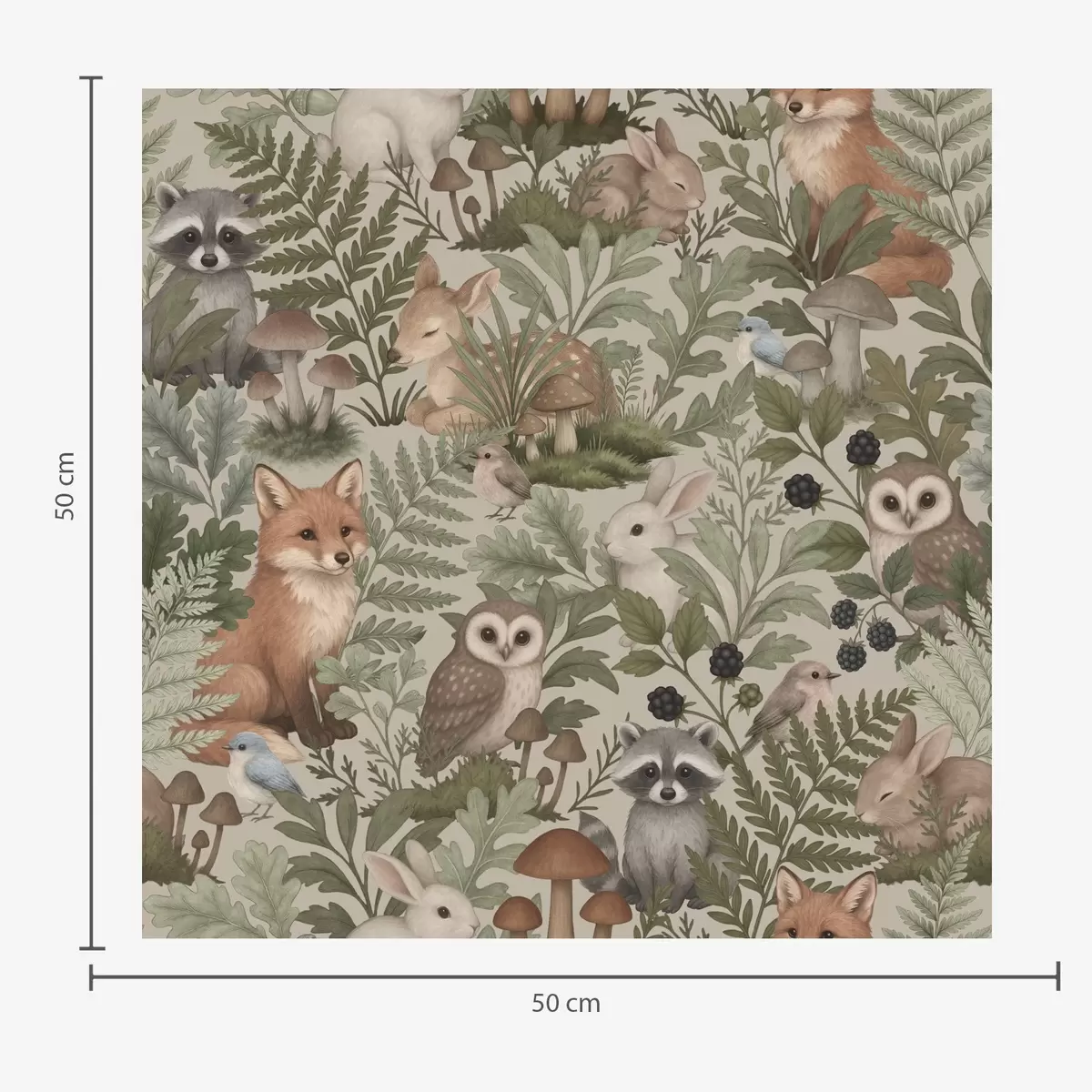 Tapet Animale din pădure, ferigi și ciuperci pe fond bej deschis Nr. a00880v1