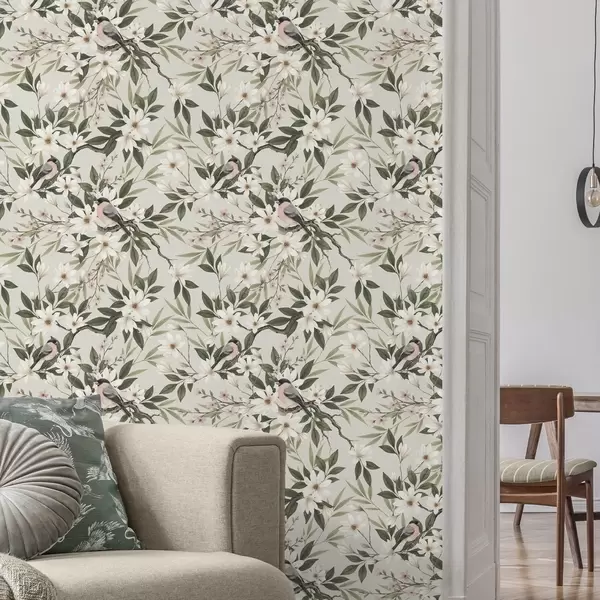 Tapet Cinte cu piept alb pe ramuri cu flori crem Nr. a00889